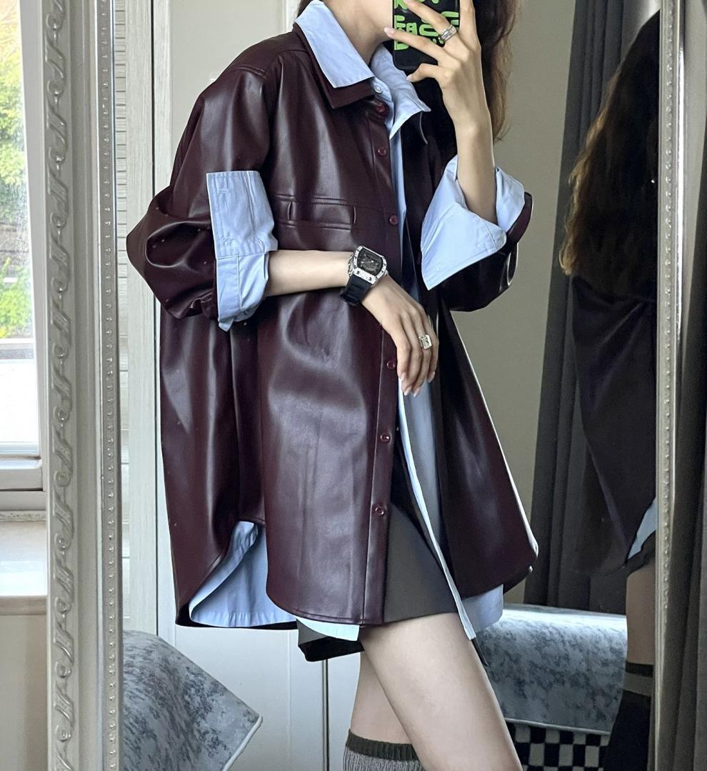 2025 가을, 겨울 신제품 포도 보라색 PU 가죽 자켓 여성 레트로 자켓 다목적 셔츠 패션 슈트