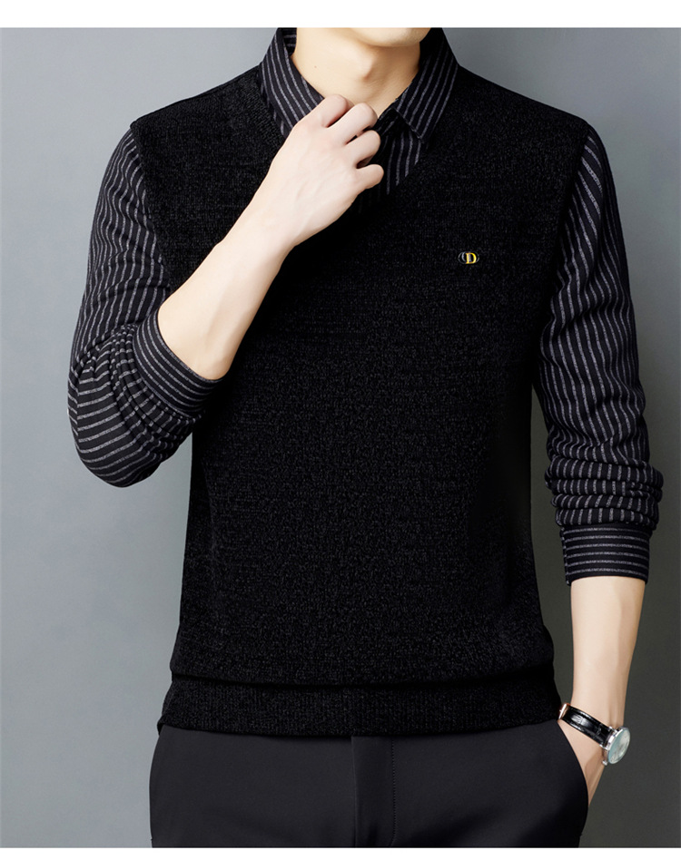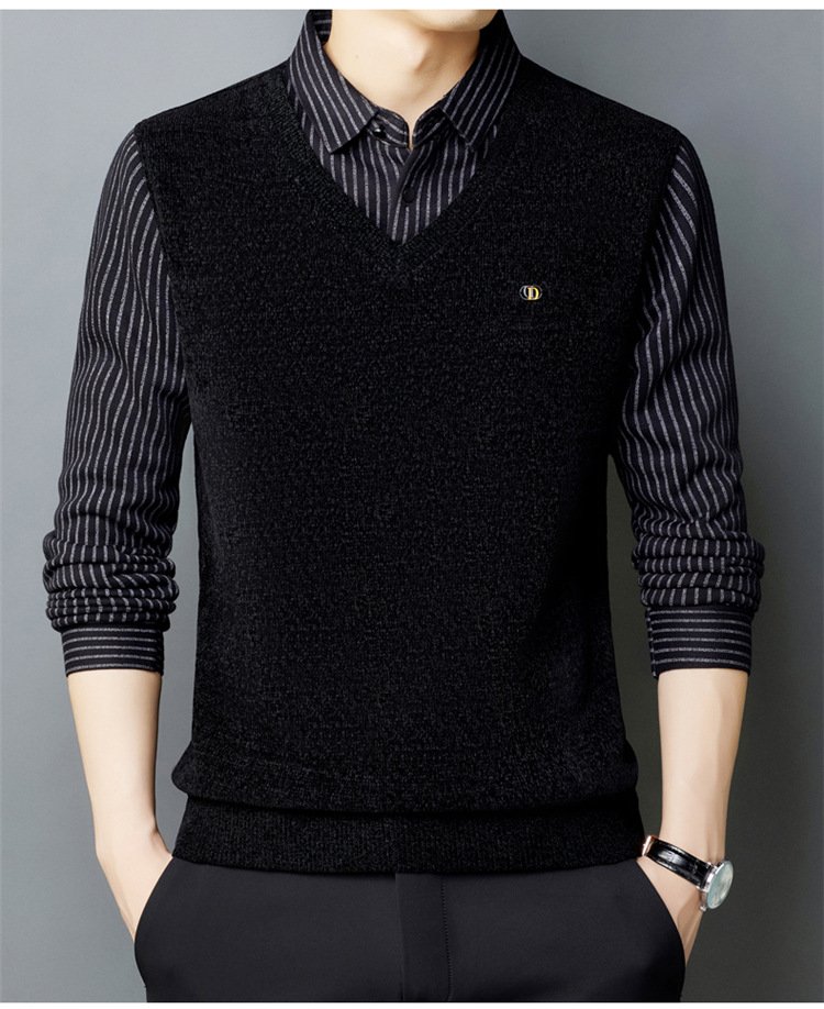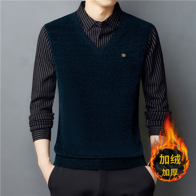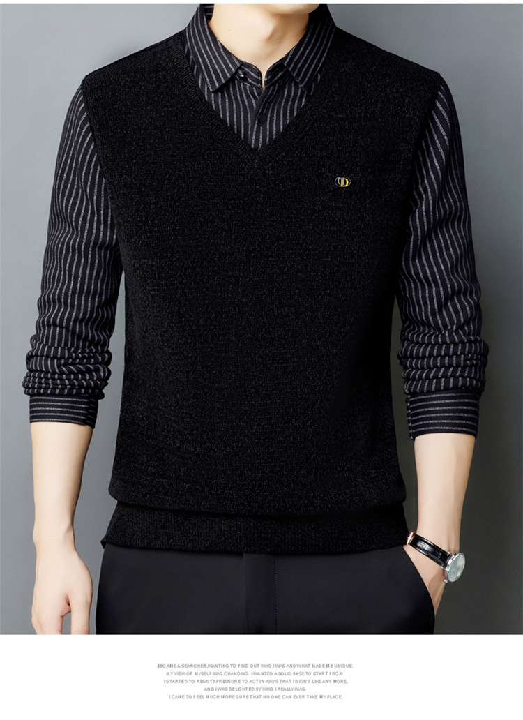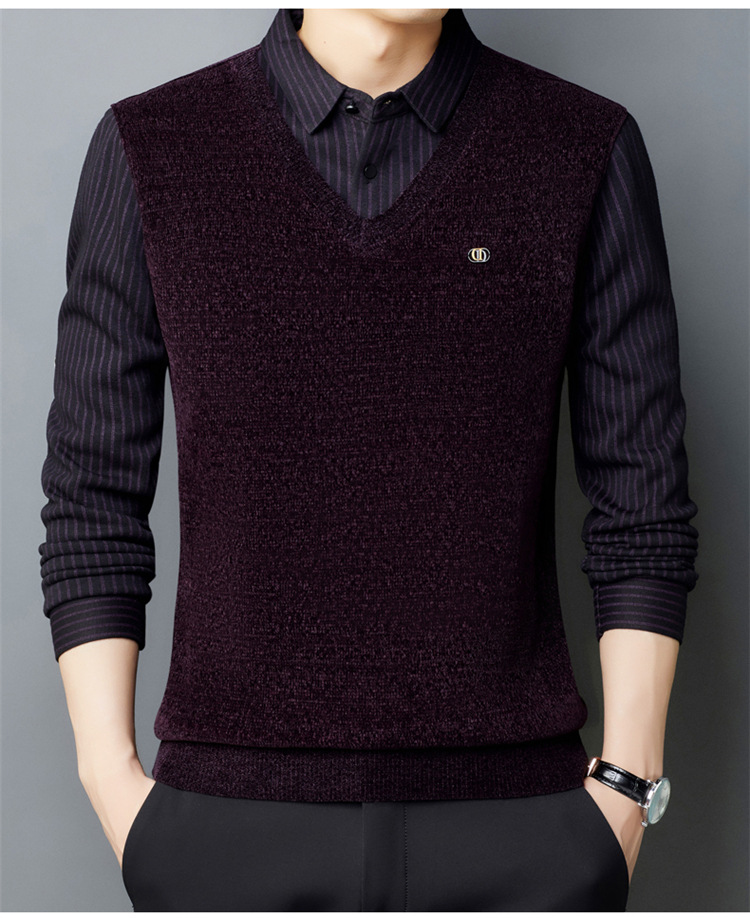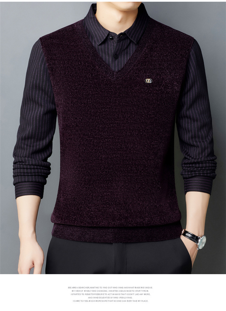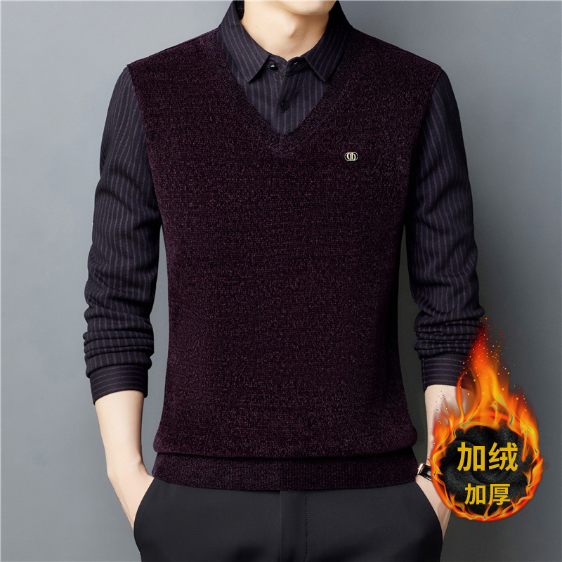 셔닐 가짜 투피스 스웨터 남자의 가을과 겨울 기모 두꺼운 니트 베이스 셔츠 청소년 따뜻한 셔츠 칼라 탑