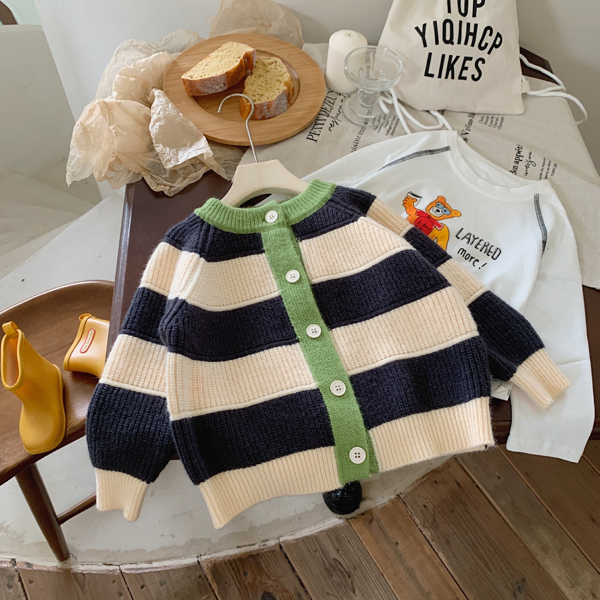 어린이 스웨터 2025 Bangcheng 가을 겨울 한국 스타일 남녀 공용 스트라이프 배색 스웨터 재킷 캐주얼 가디건 F0461