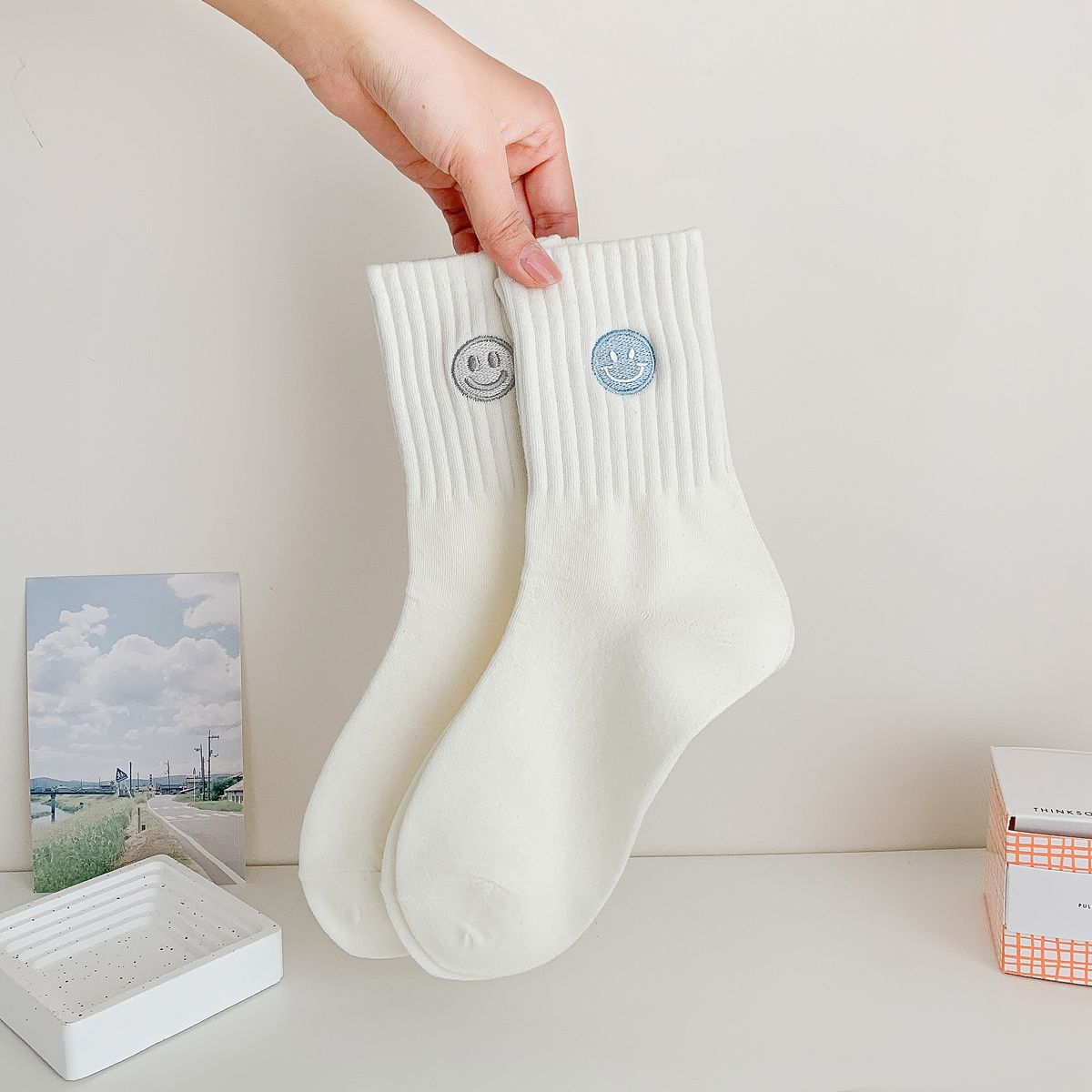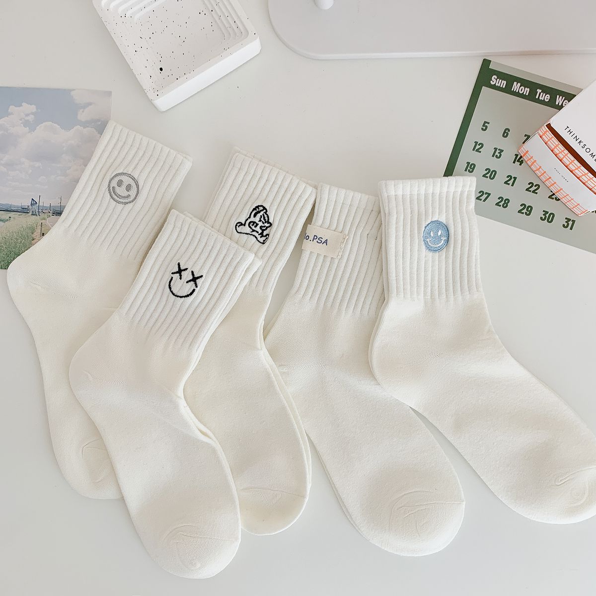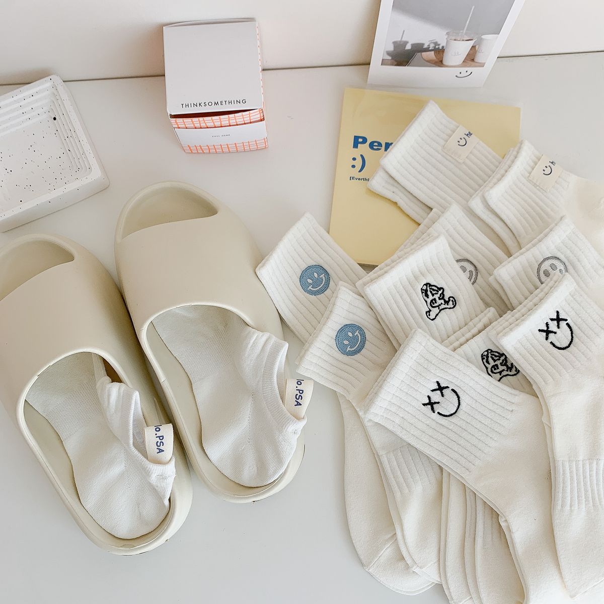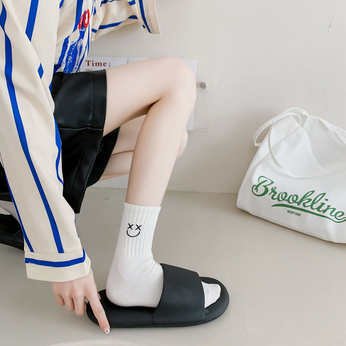 새로운 스타일 양말 여자의 일본식 스마일 작은 흰색 양말 가을 단색 중간 및 짧은 튜브 여자 양말 편지 트렌디 개인화 된 학생스토어 가기