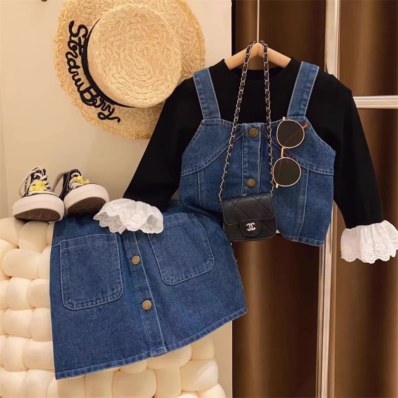 신상 여아 싱글 브레스트 캐미솔 베이스 티셔츠 스커트 데님 쓰리피스 세트 2023 봄 옷 봄 가을 세트