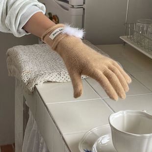 日韩毛线针织手套冬天保暖可爱学生毛线纯色毛球五指触屏手套女士