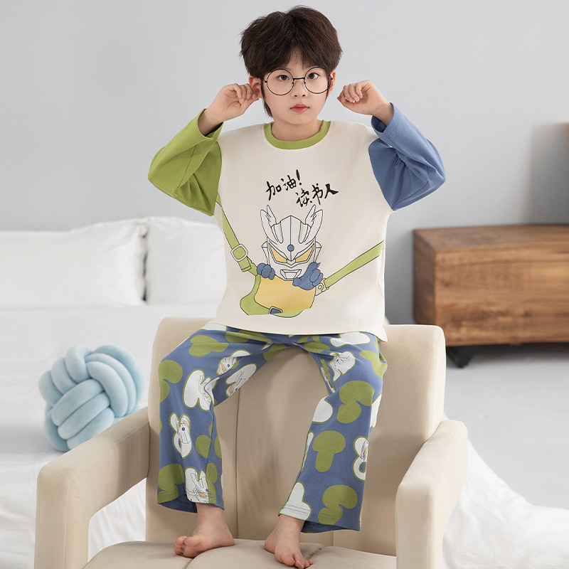 100% 순면 남아용 봄 가을 코마사 면 만화 어린이 잠옷 청소년 및 중년 아동용 캐주얼 홈웨어