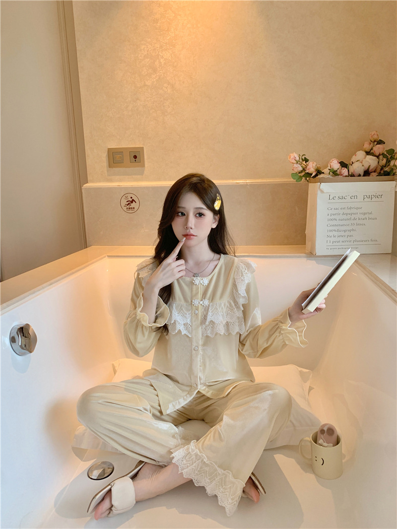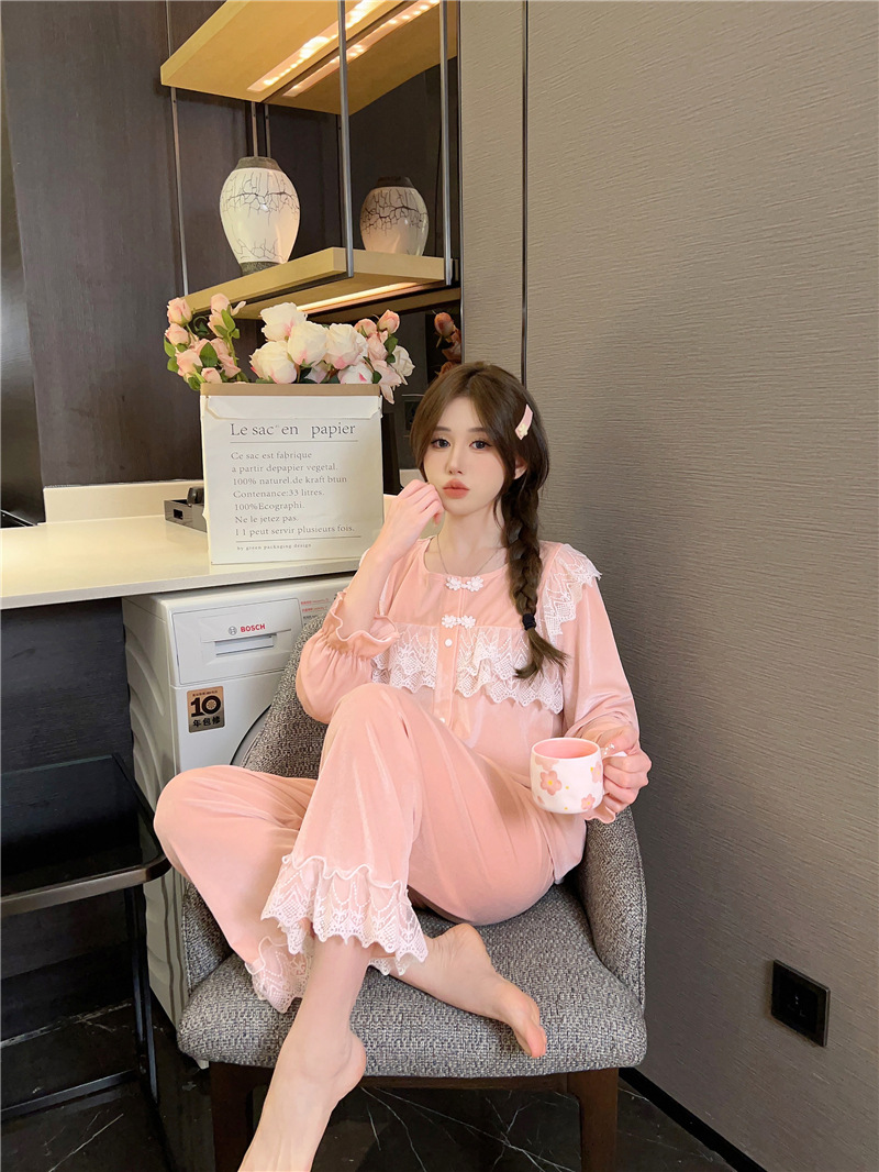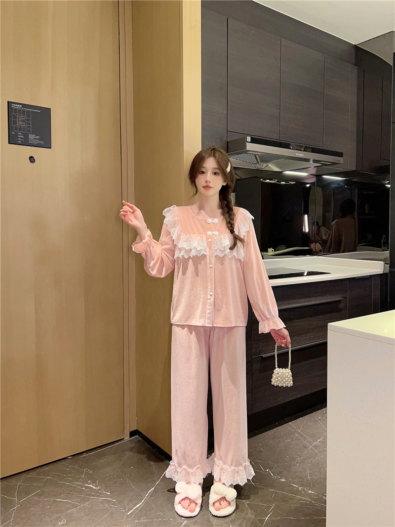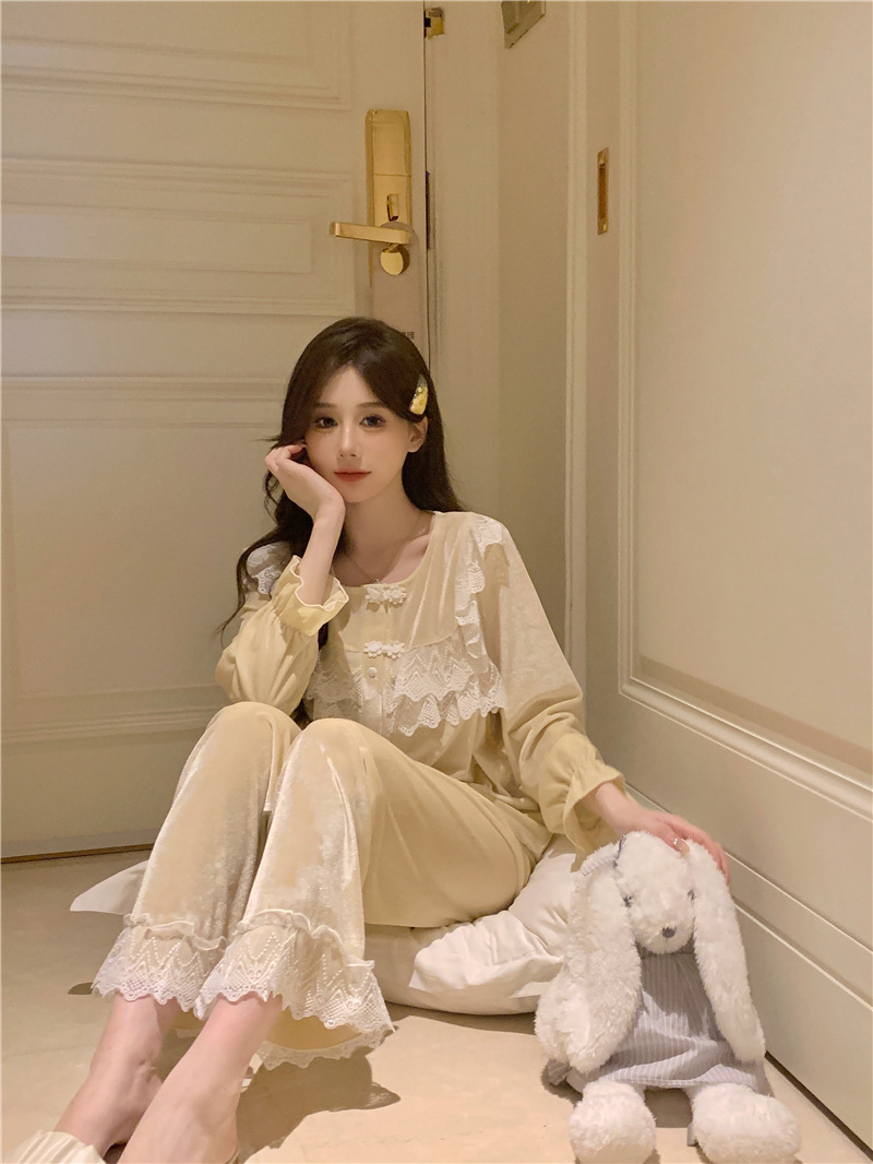 잠옷 여성의 가을과 겨울 새로운 한국 벨벳 레이스 따뜻한 달콤한 긴 소매 바지 세트 홈웨어