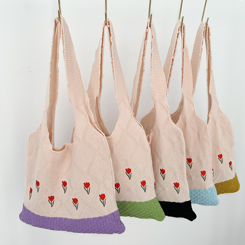 여름 한국 니트 모리 여성 가방 복고풍 예술적 자수 꽃 토트 백 신선한 스타일 유행 핸드 숄더 백