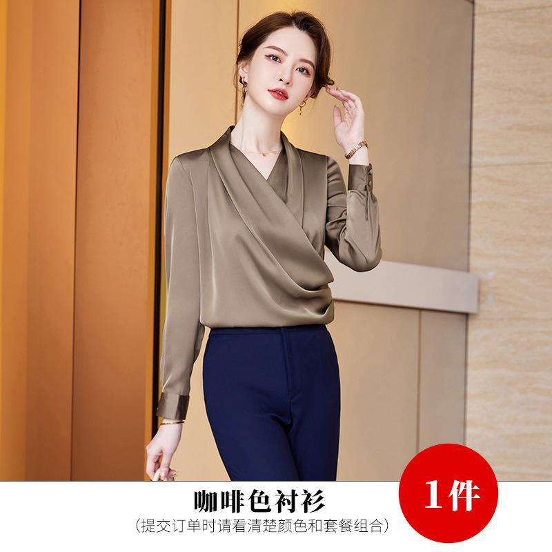 2023 봄과 가을 새로운 패션 긴팔 쉬폰 셔츠 여성용 가을 고기 덮인 디자인 틈새 페르시 V-넥 셔츠스토어 가기