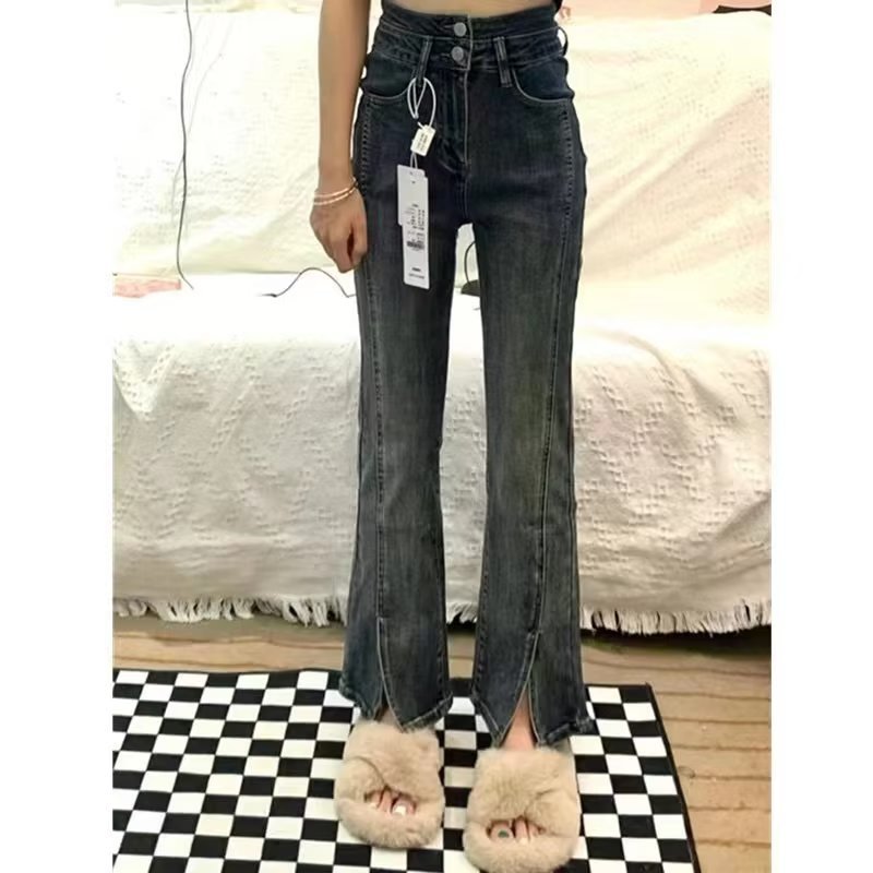 마이크로 플레어 스플릿 청바지 여성용 스트레이트 느슨한 가을 새로운 높은 허리 슬리밍 작은 탄성 넓은 다리 바지스토어 가기