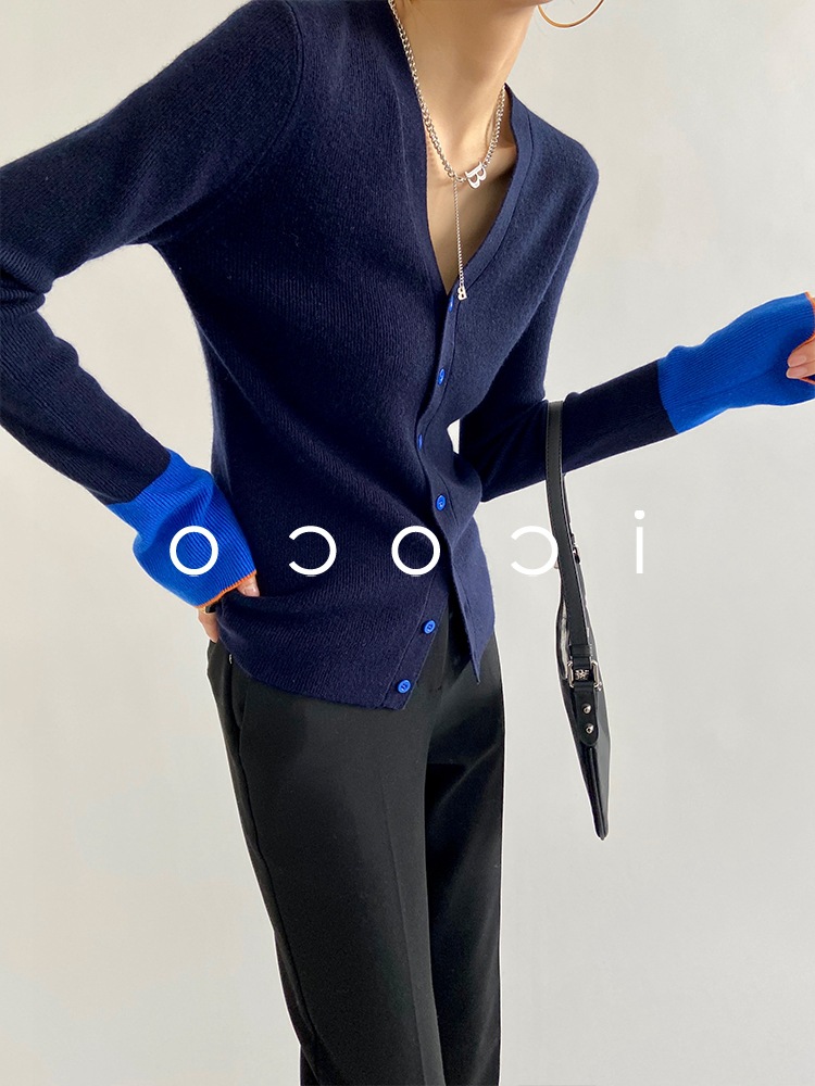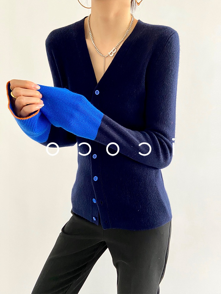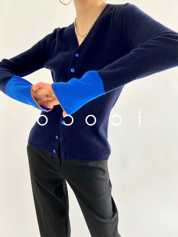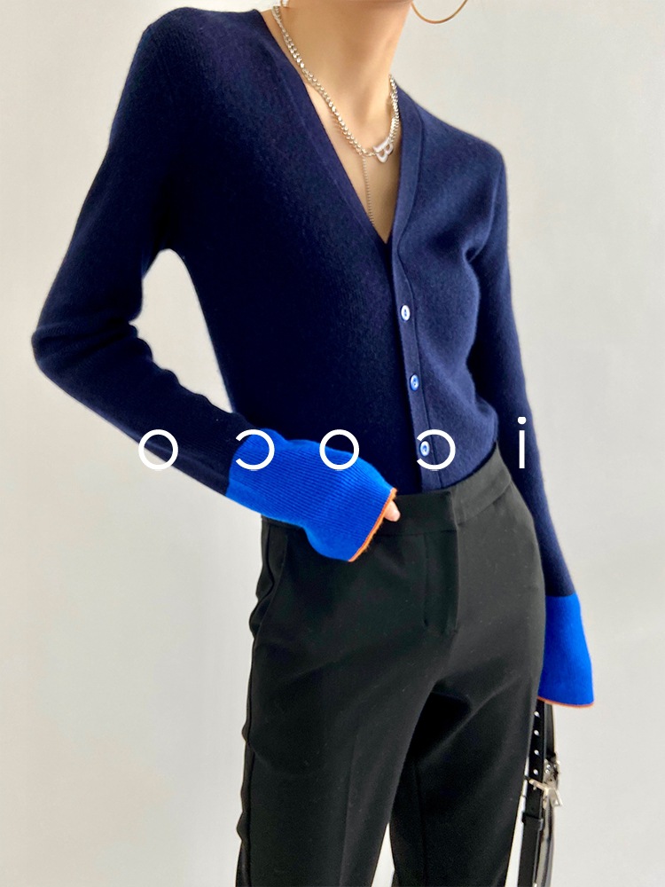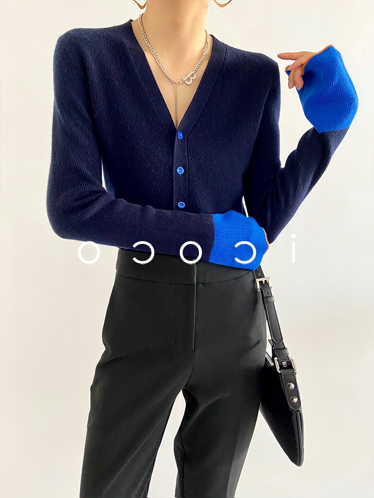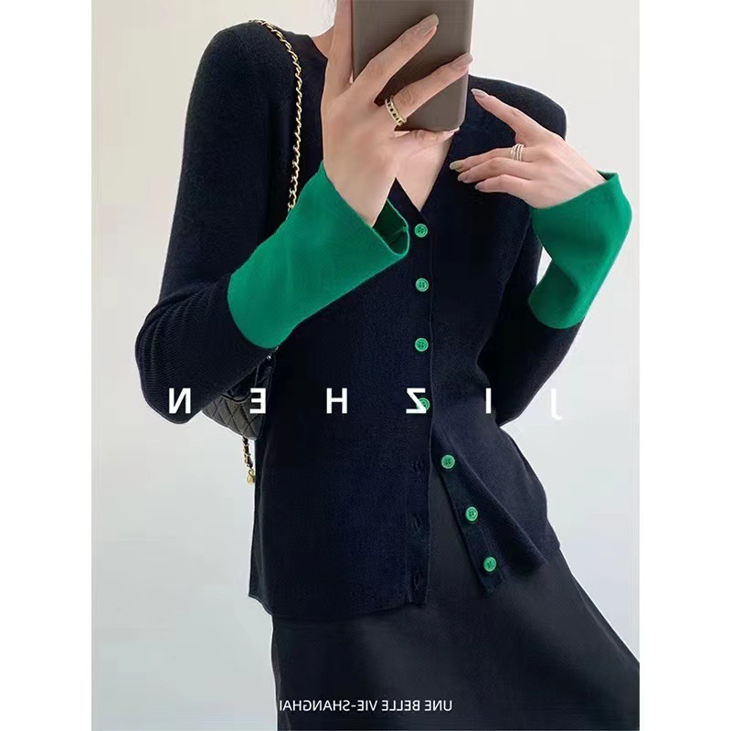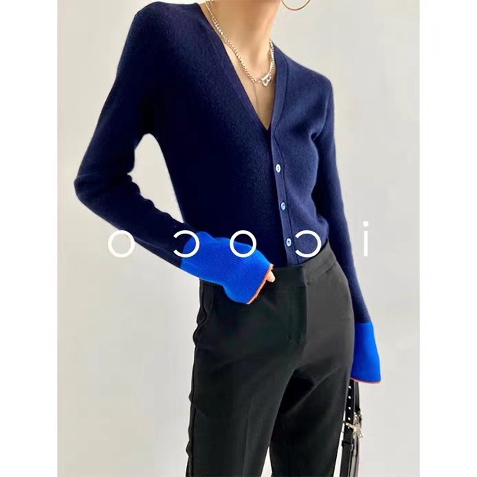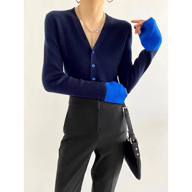 프렌치 레트로 클라인 블루 대비 컬러 니트 카디건 여성 2023 가을과 겨울 새로운 슬림핏 V-넥 플레어 슬리브 탑스토어 가기