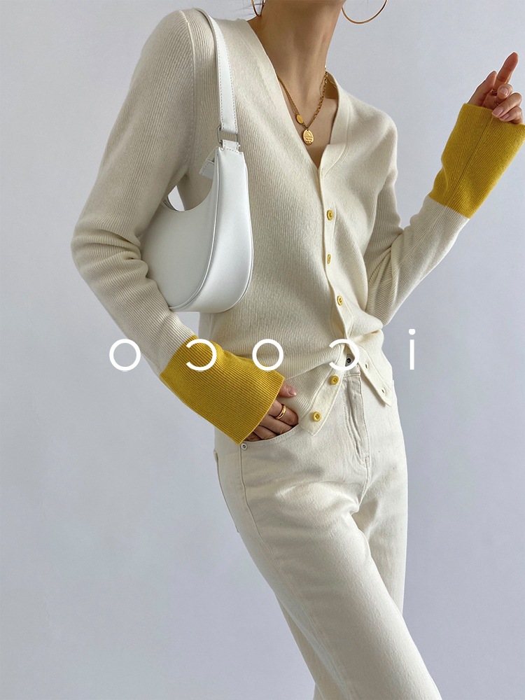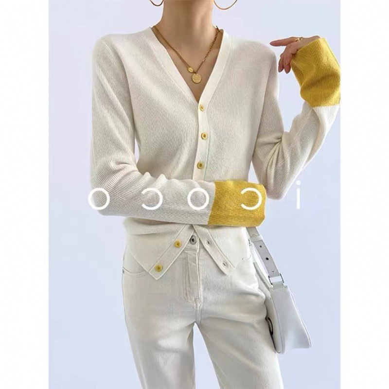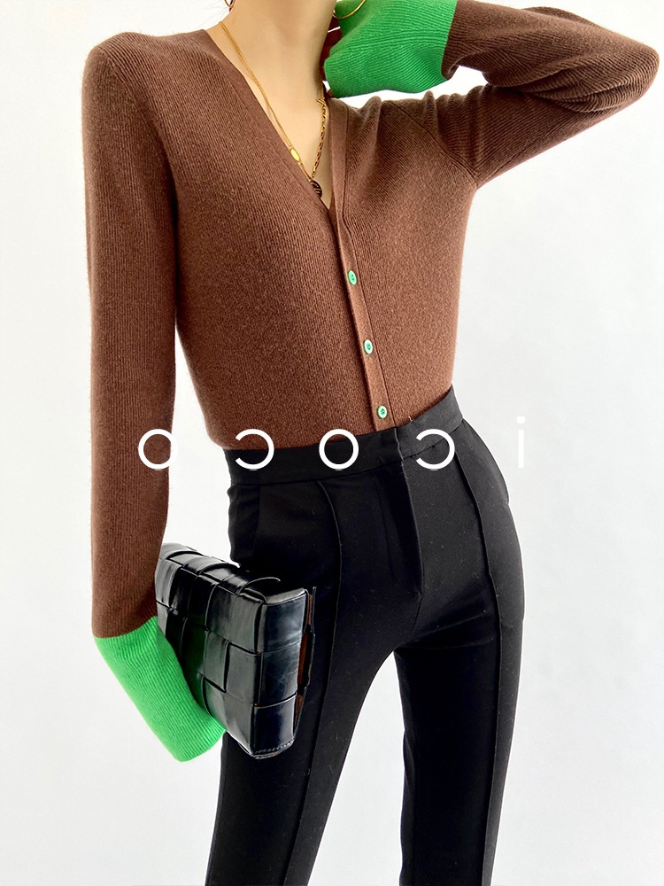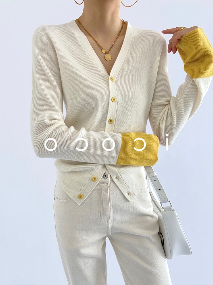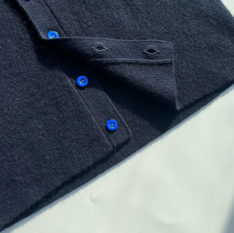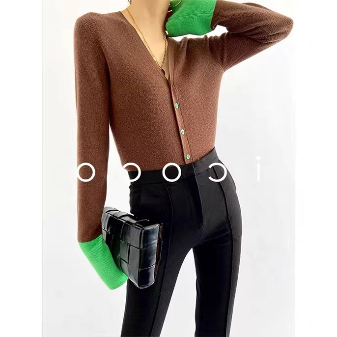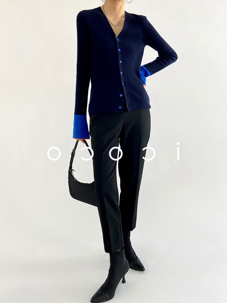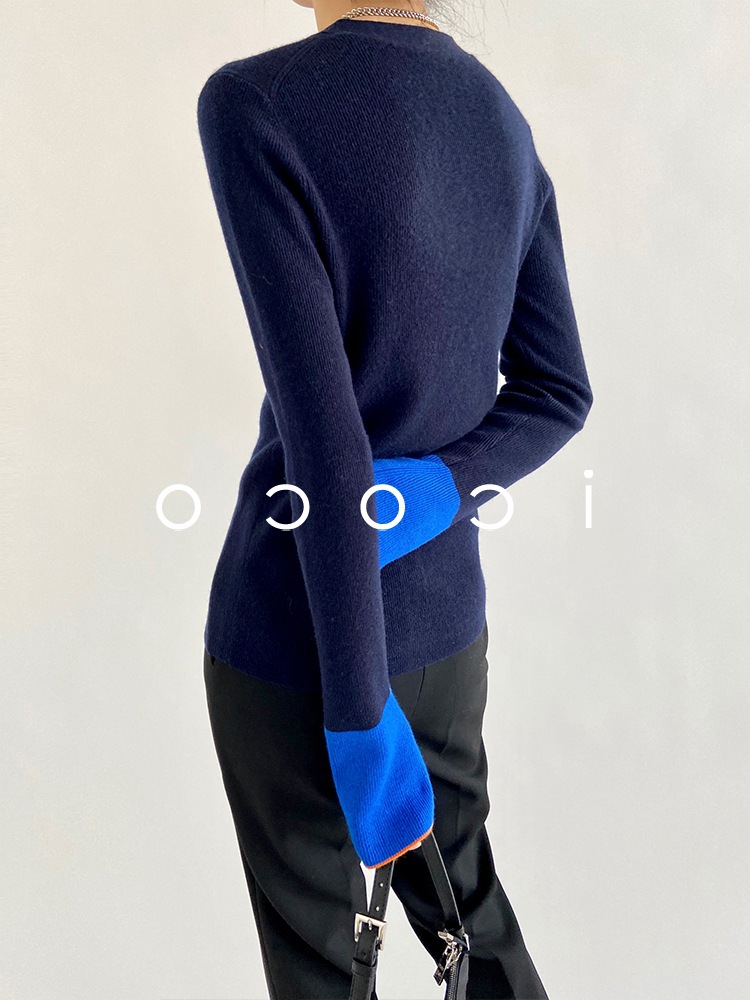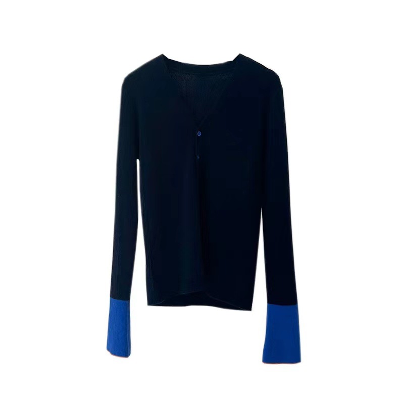 프렌치 레트로 클라인 블루 대비 컬러 니트 카디건 여성 2023 가을과 겨울 새로운 슬림핏 V-넥 플레어 슬리브 탑스토어 가기