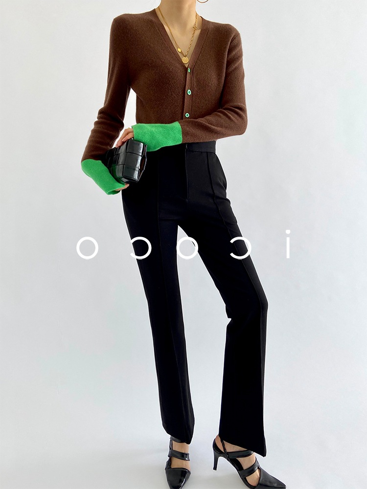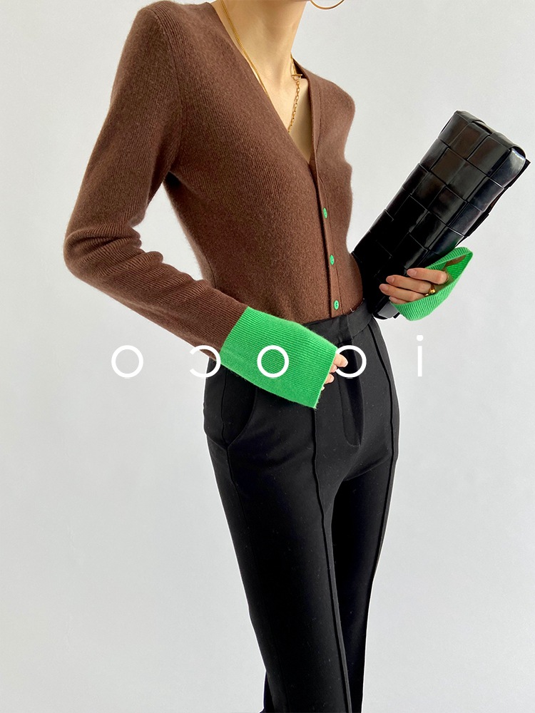 프렌치 레트로 클라인 블루 대비 컬러 니트 카디건 여성 2023 가을과 겨울 새로운 슬림핏 V-넥 플레어 슬리브 탑