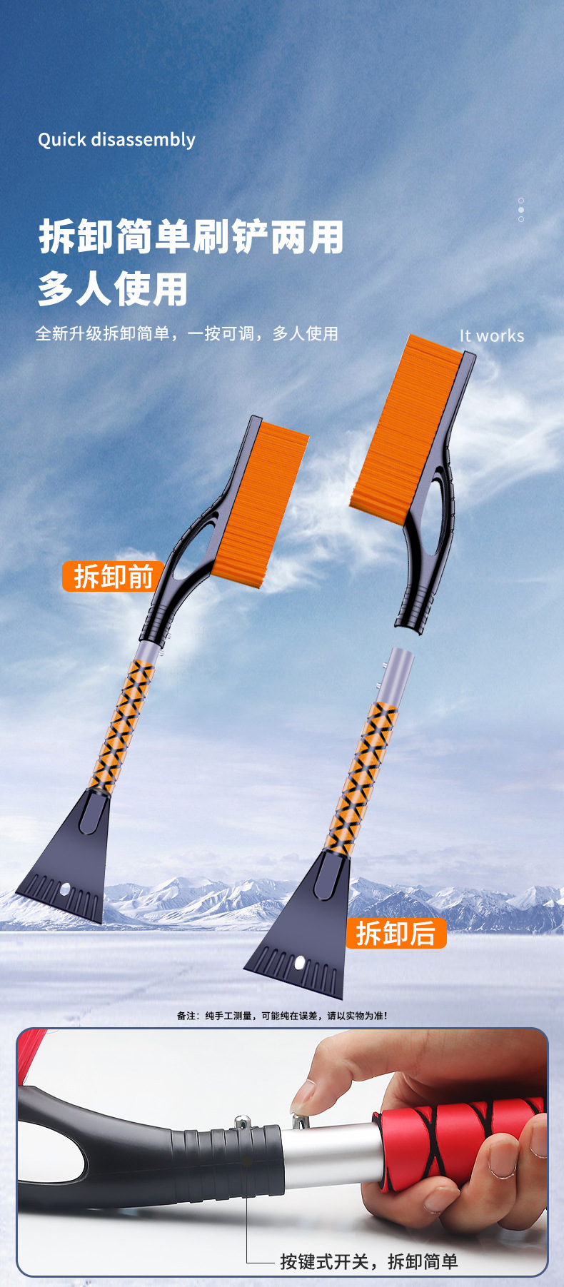 ●除雪铲头:采用ABS高强度塑料铸造成形,坚硬牢固