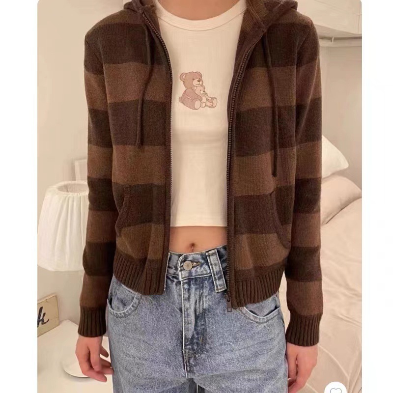 BM 바람 가을 스트라이프 스티칭 스웨터 여성용 BM 슬림 슬림 카디건 지퍼 후드 짧은 코트 탑스토어 가기