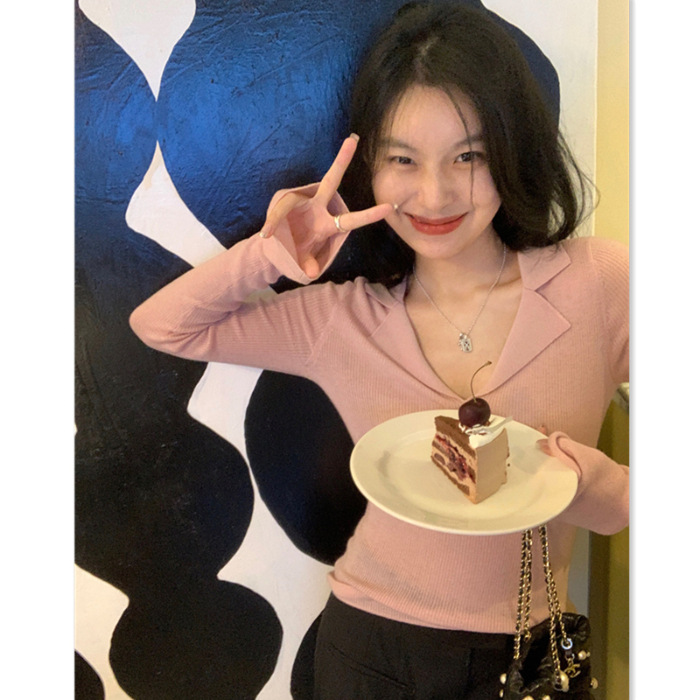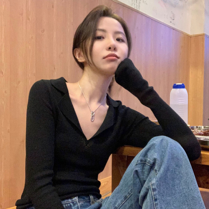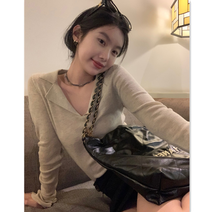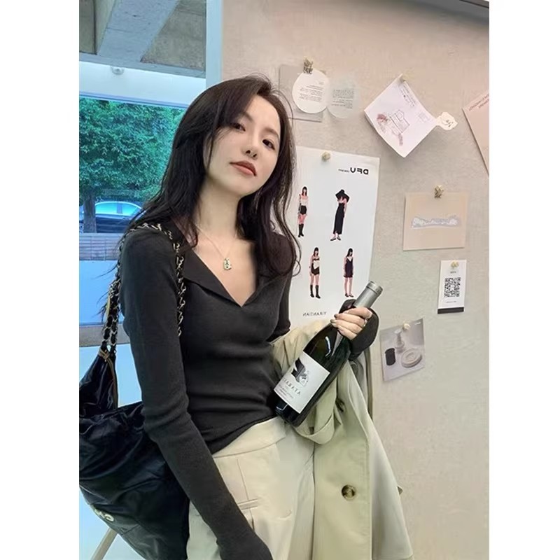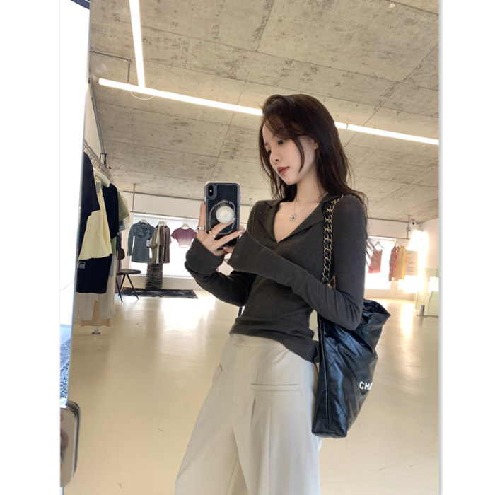 이른 가을 회색 POLOv 칼라 긴팔 니트 베이스 셔츠 여성용 가을 겉옷 티셔츠 내부 슬림핏 짧은 탑