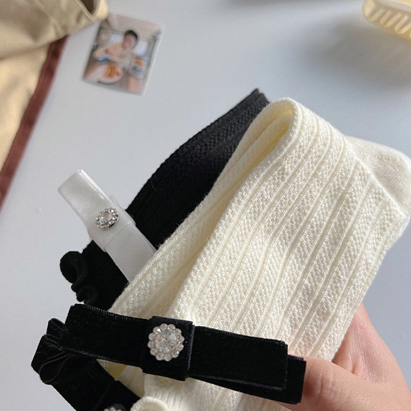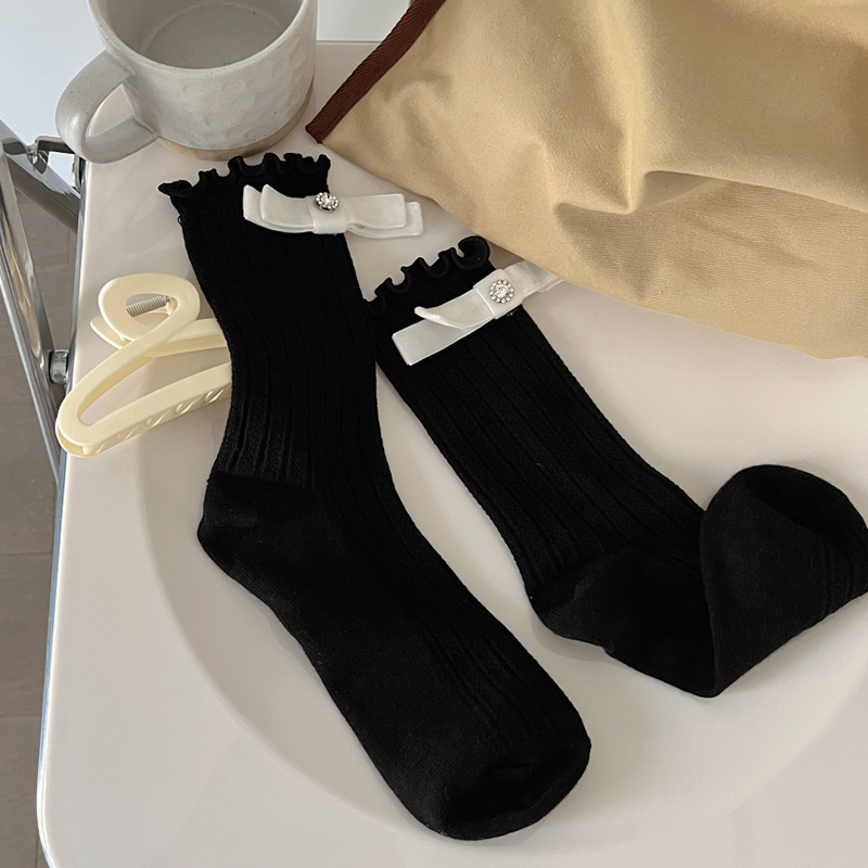 Xiao Xiang 스타일 보우 여아 양말 중간 길이 양말 달콤한 우드 이어 쌓인 양말 흑백 대비 색상 양말 한국 스타일
