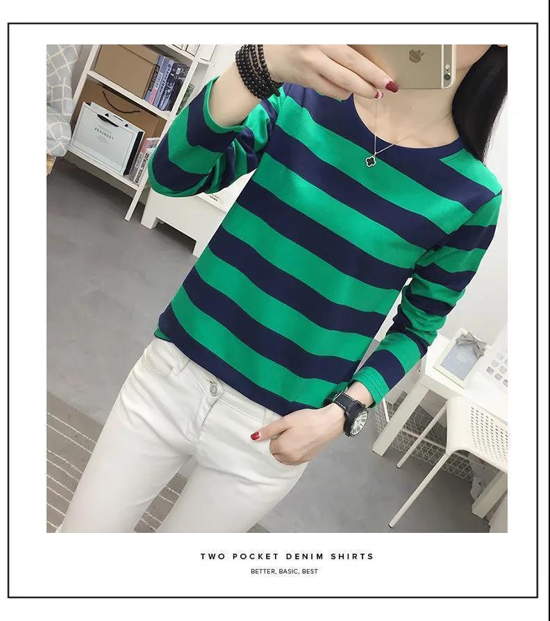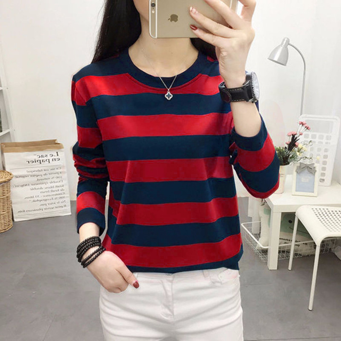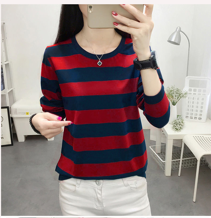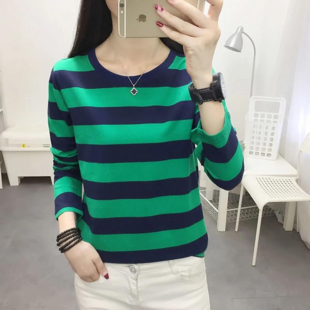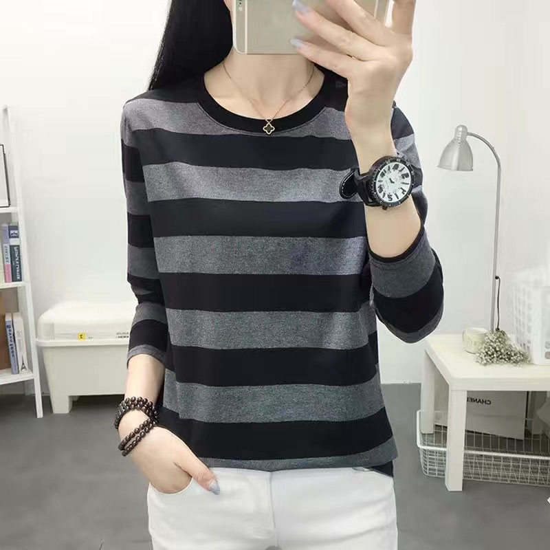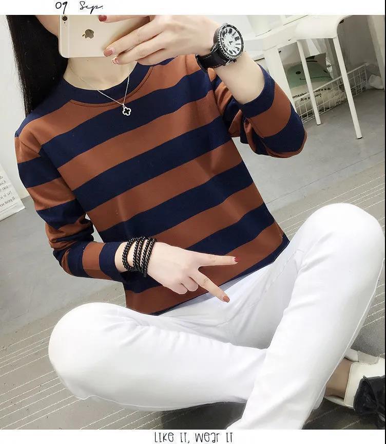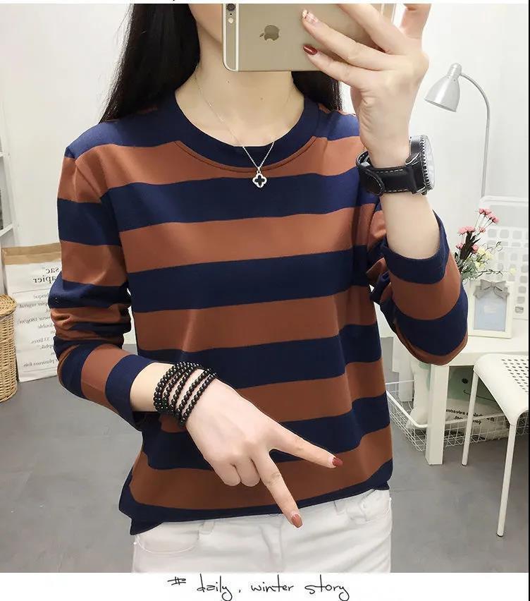 스트라이프 티셔츠 여자의 봄 신상품 플러스 사이즈 여자의 티셔츠 긴 소매 베이스 셔츠 느슨한 한국 스타일 겨울 탑 작은 셔츠