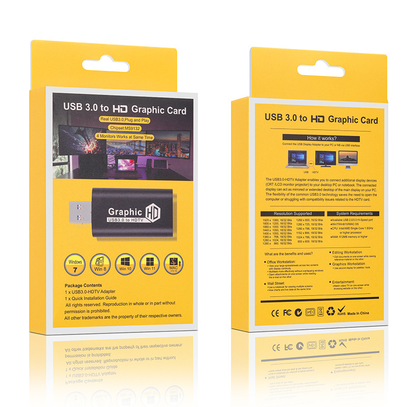 The USB3.0-HDTV Adapter enables you to connect additional display devices(CRT /LCD monitor projector) to your desktop PC or notebook. The connected display can act as mirrored or extended desktop of the main display on your PCThe flexibility of the common USB3.0 technology saves the need to open thecomputer or struggling with compatibility issues related to the HDTV card.