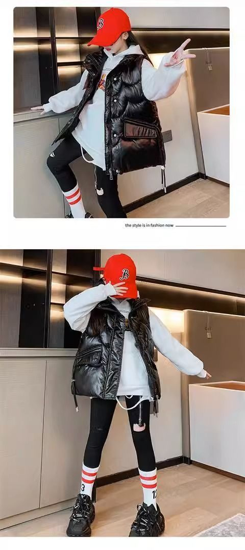 가을과 겨울 다운 코튼 조끼 2023 새로운 여아 워시프리 광택 조끼 큰 어린이를위한 따뜻한 조끼