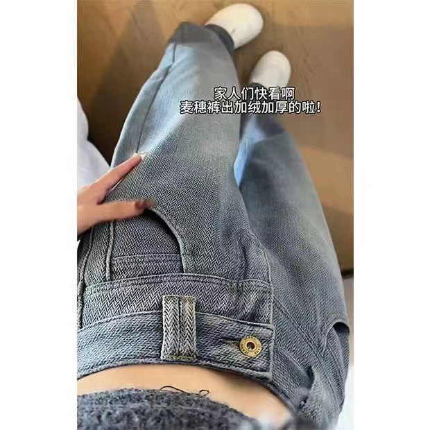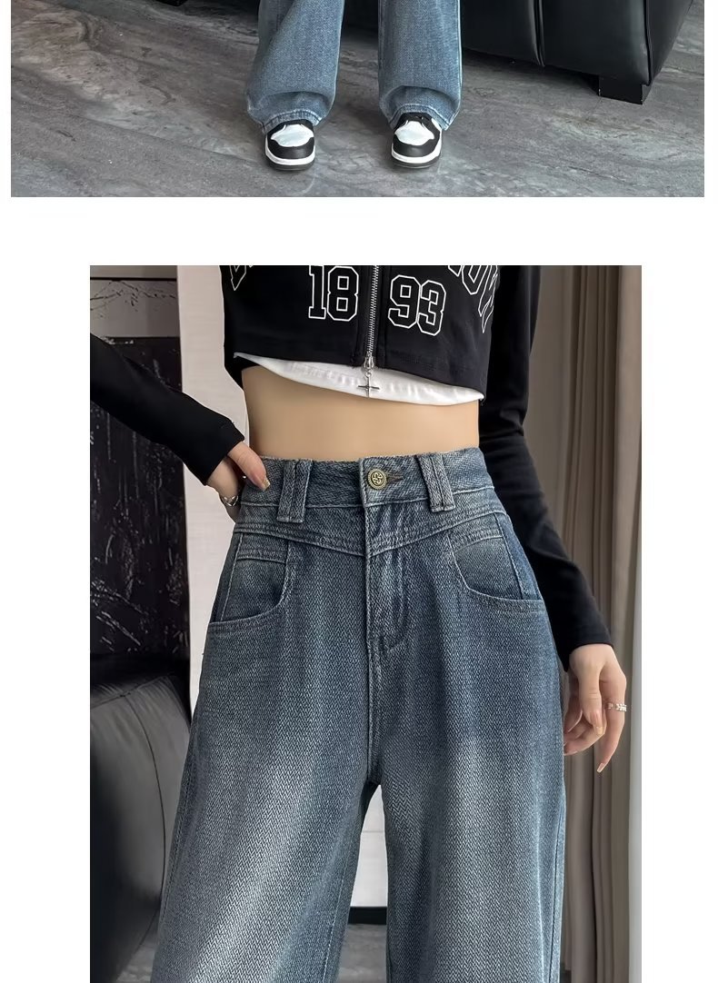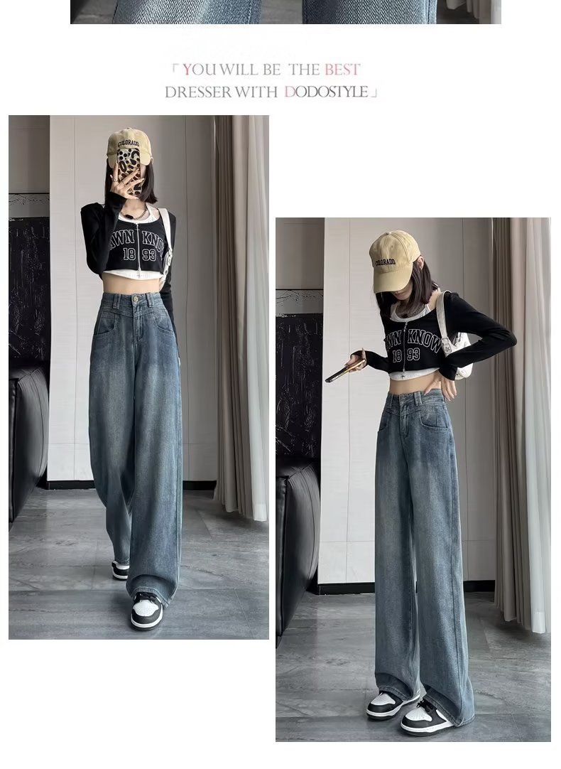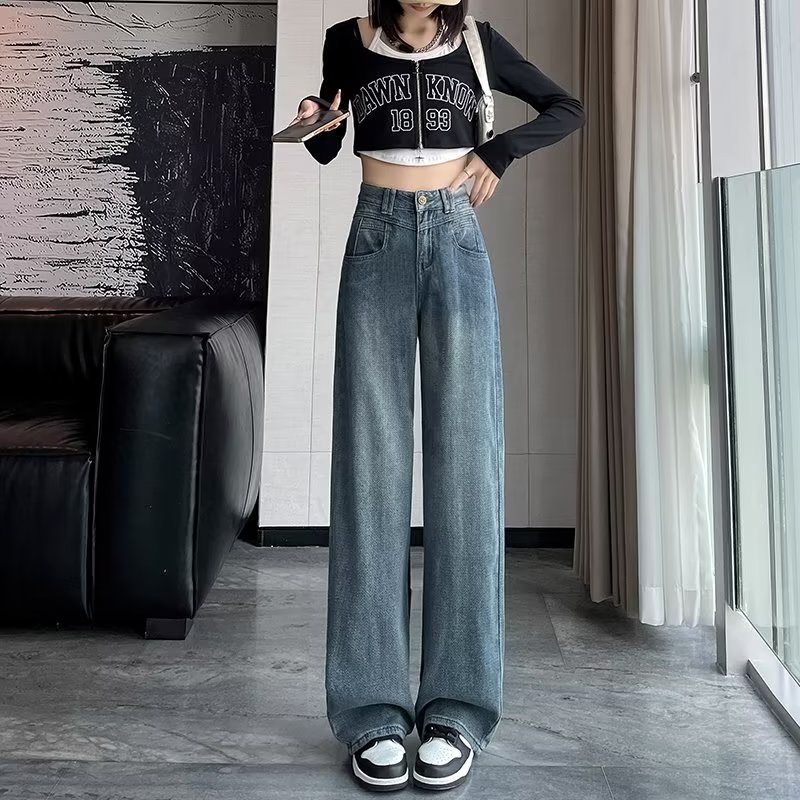 빈티지 블루 하이 웨이스트 스트레이트 청바지 여성의 가을 얇은 가을 2023 새로운 담근 느슨한 슬리밍 와이드 레그 팬츠스토어 가기
