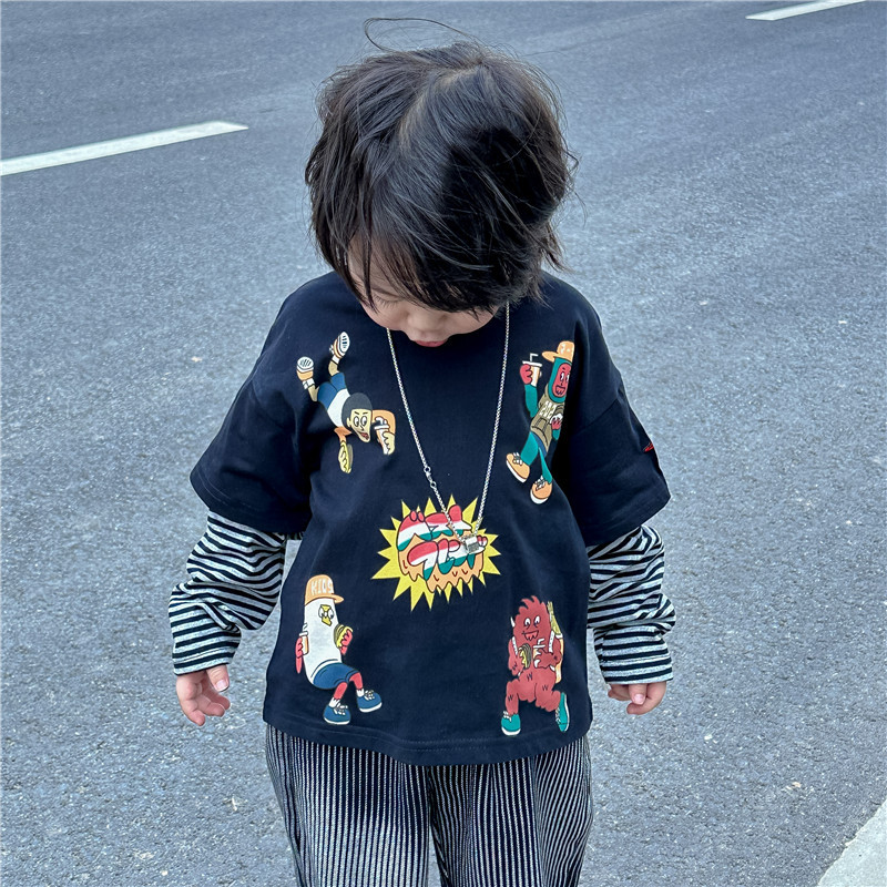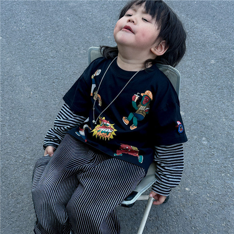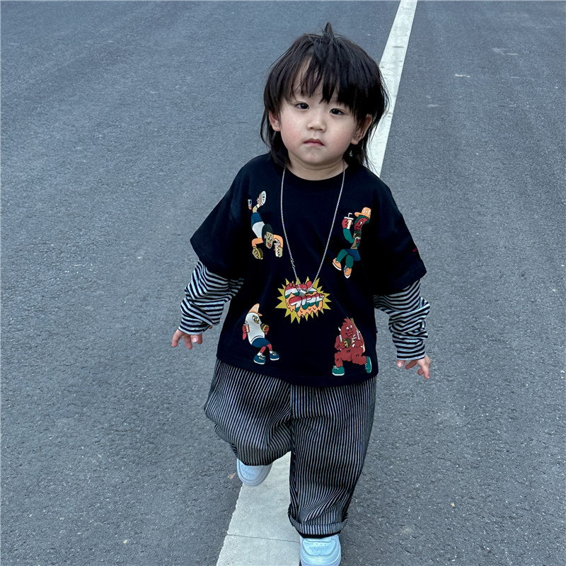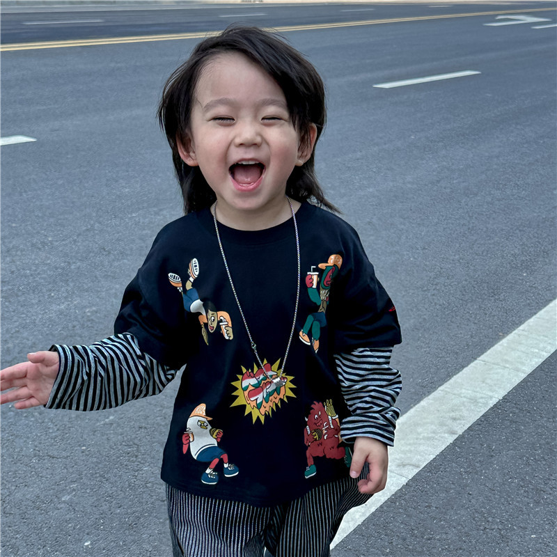어린이 긴팔 티셔츠 소년 가을 2024 년 새로운 느슨한 핸섬 가짜 투피스 스티칭베이스 보이즈의 최고 트렌디스토어 가기