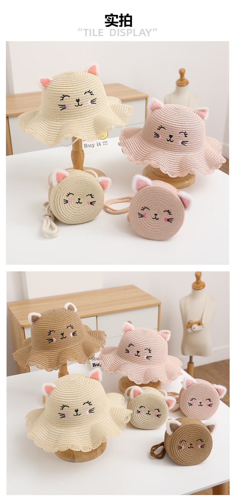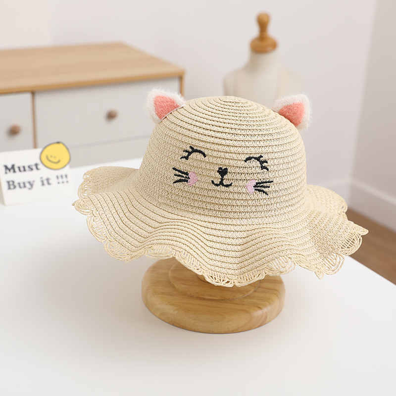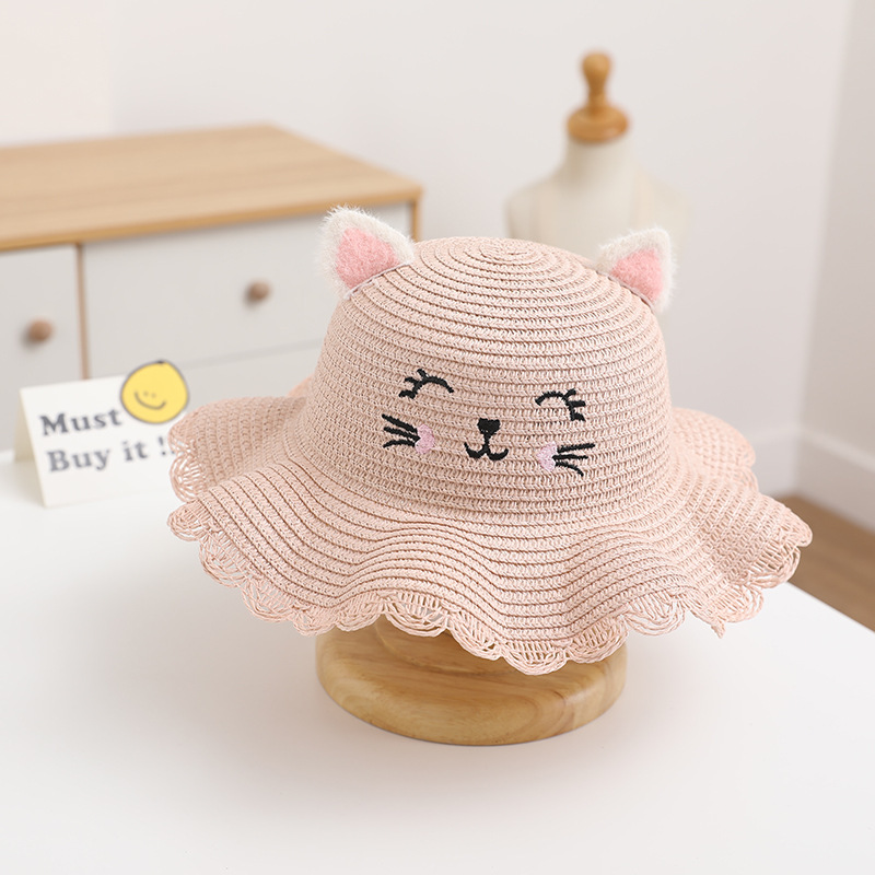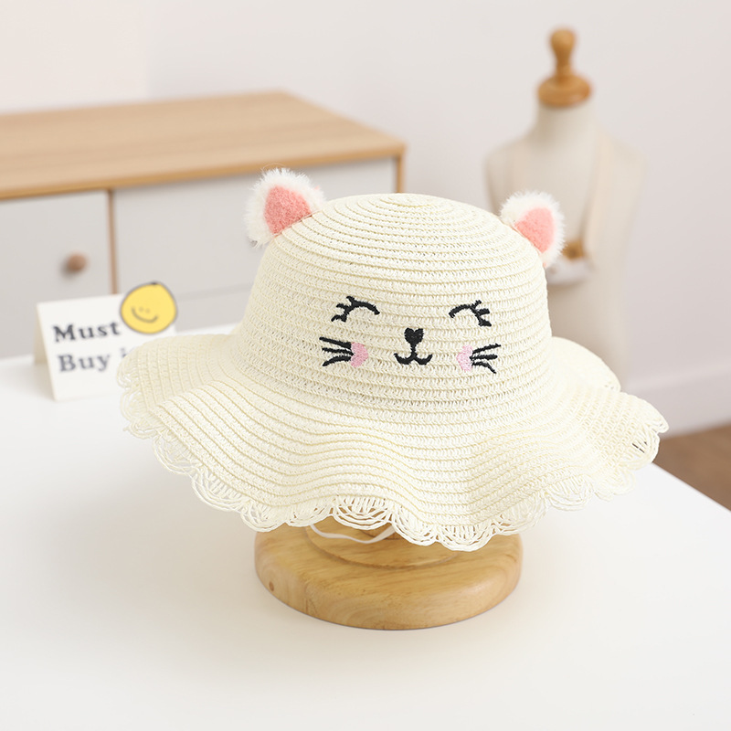여름 어린이 밀짚 모자 여성 귀여운 고양이 귀 모자 태양 보호 태양 모자 해변 접이식 밀짚 모자 가방 세트스토어 가기