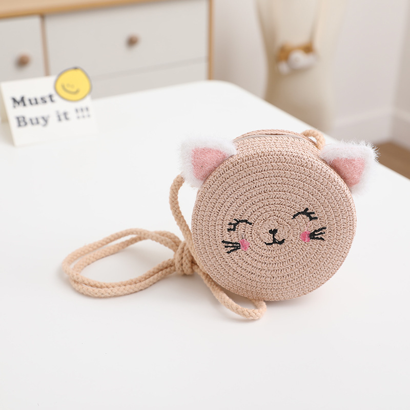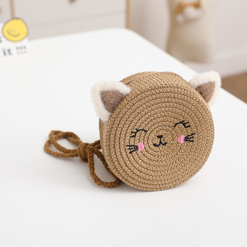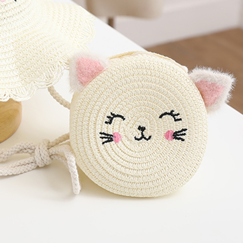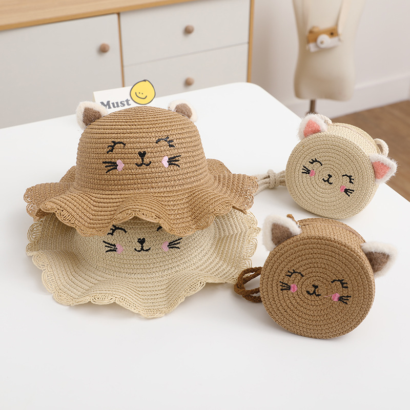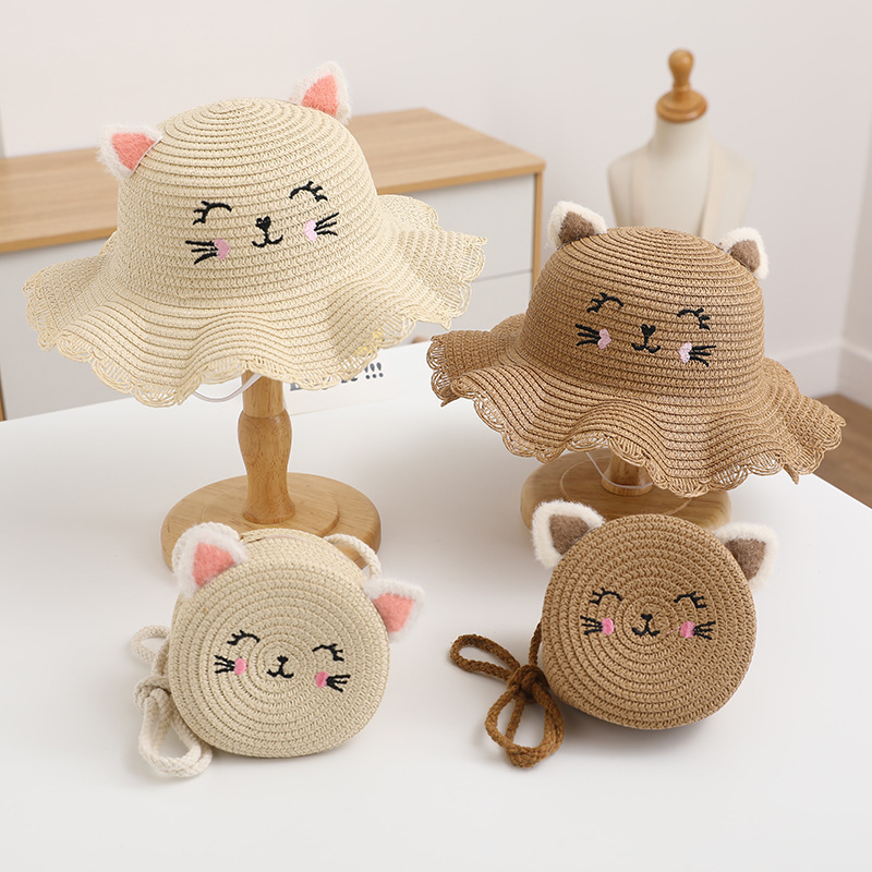 여름 어린이 밀짚 모자 여성 귀여운 고양이 귀 모자 태양 보호 태양 모자 해변 접이식 밀짚 모자 가방 세트