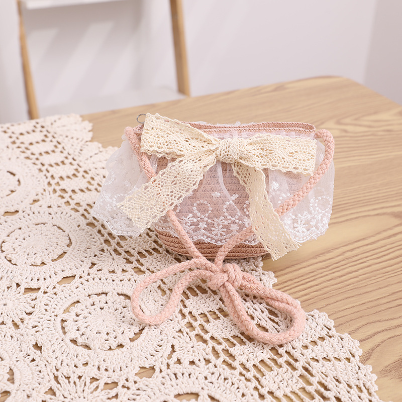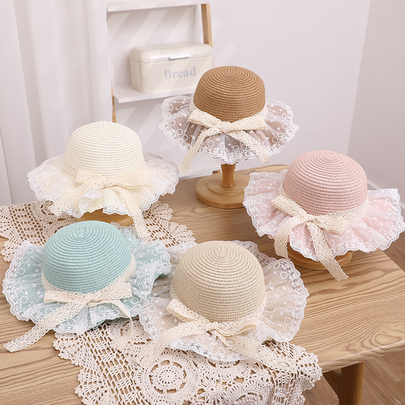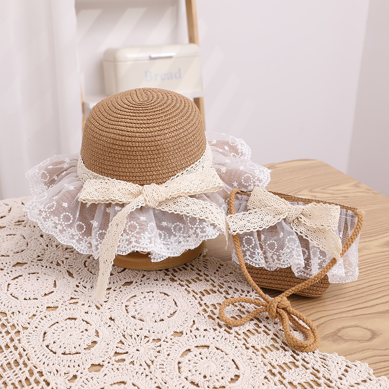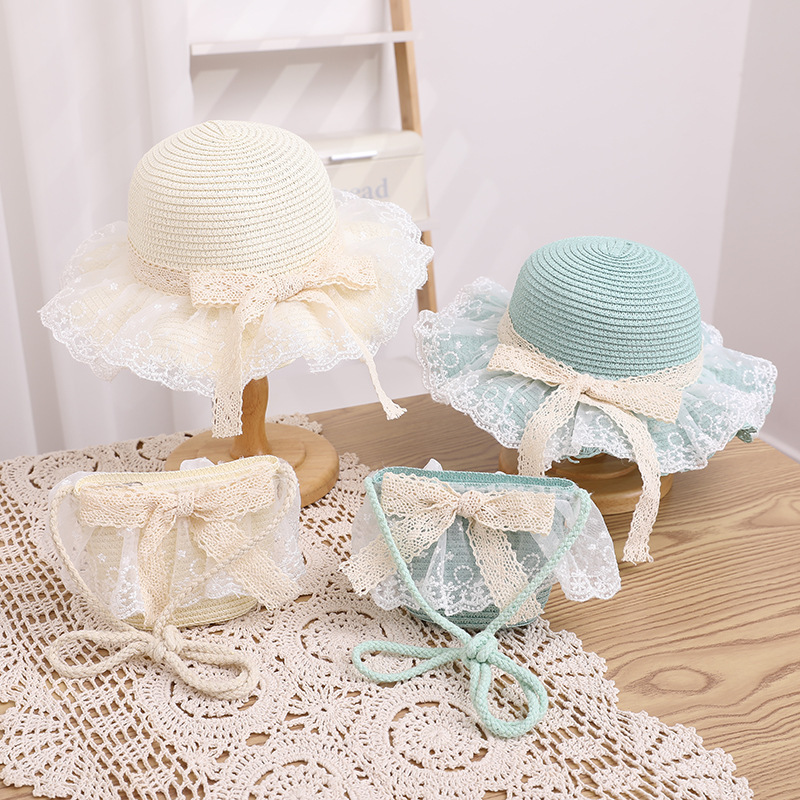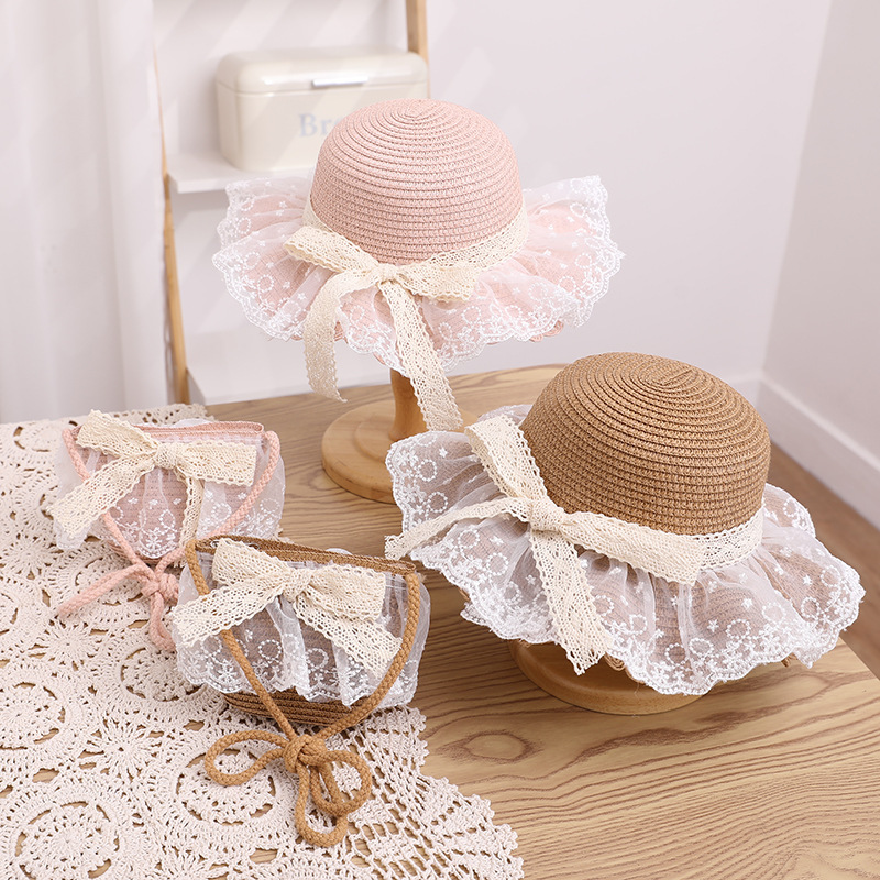 인기있는 레이스 모자 여름 태양 방지 어부 모자 밀짚 모자 가방 세트 어린이 공주 모자 소녀 해변 밀짚 모자