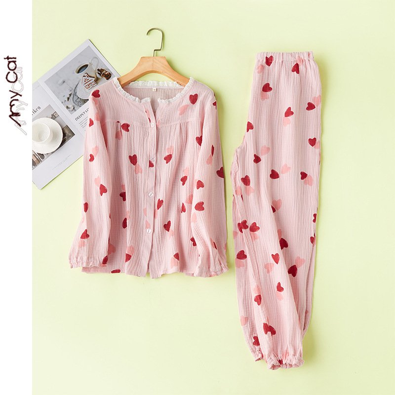 가을 퓨어 코튼 더블 레이어 거즈 파자마 부모 여성의 2 색 사랑 인쇄 긴 소매 라운드 넥 홈 의류 세트