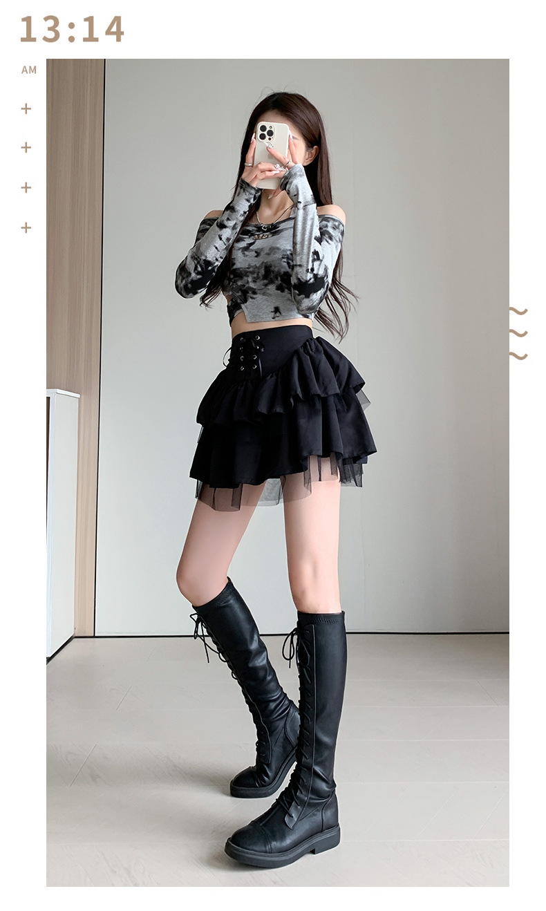 치마 여자의 봄과 가을 새로운 발레 스타일의 푹신한 짧은 치마 하이 웨이스트 메쉬 작은 검정 레이스 업 일본 jk