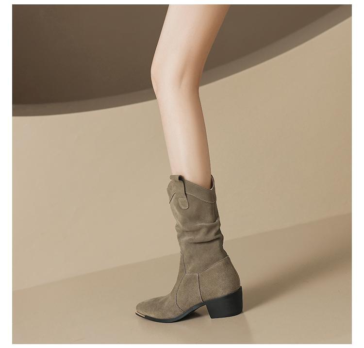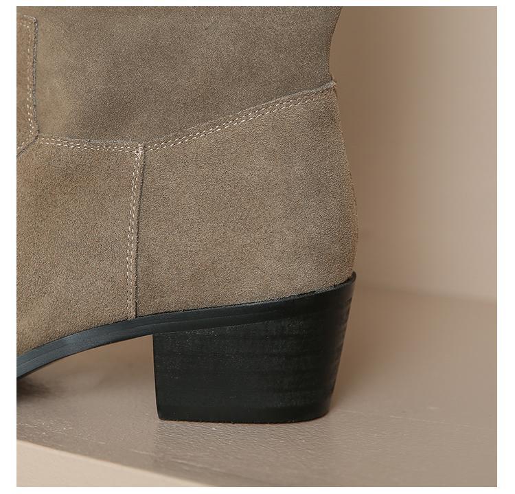 프로스트 정품 가죽 힙 부츠 여성용 2023 가을과 겨울 새로운 뾰족한 v-입 나이트 부츠 청키 힐 레트로 웨스턴 카우보이 부츠
