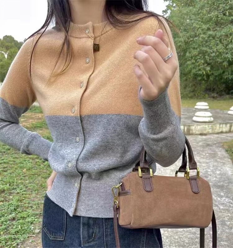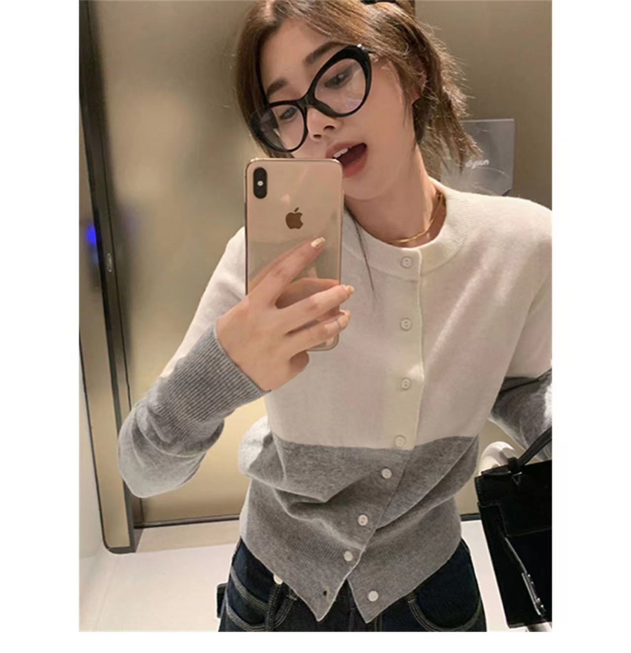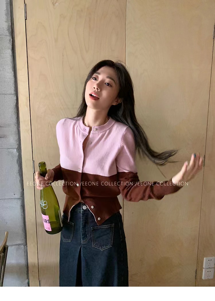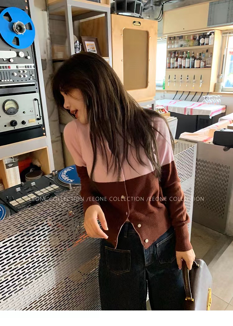 대비 색상 크루넥 울 니트 크루넥 가디건 여성용 틈새 스웨터 재킷 느슨한 모든 매치 긴팔 울 스웨터 탑스토어 가기