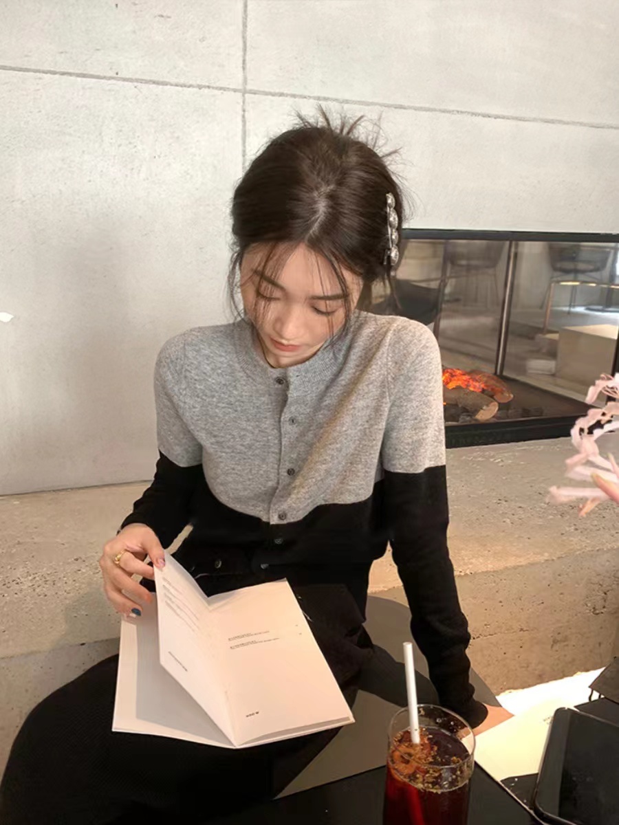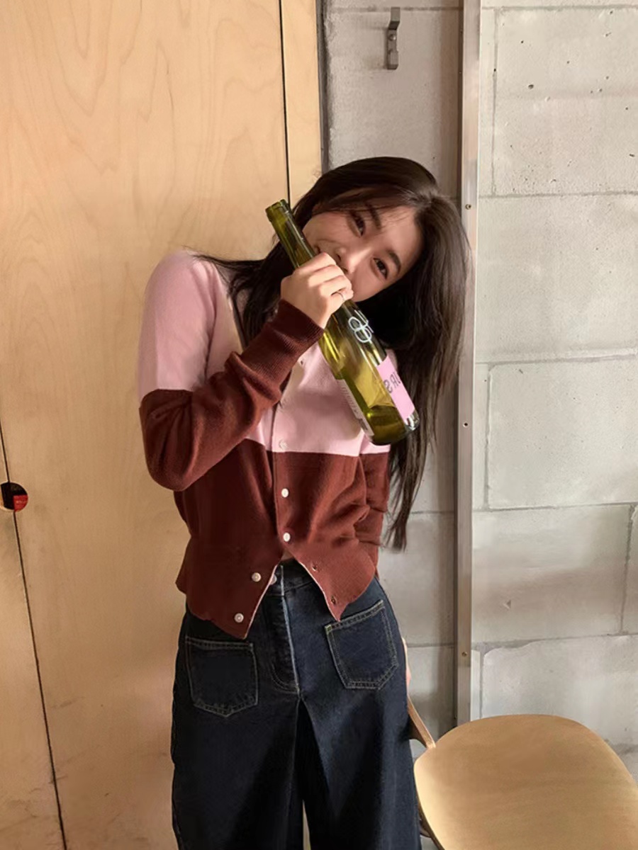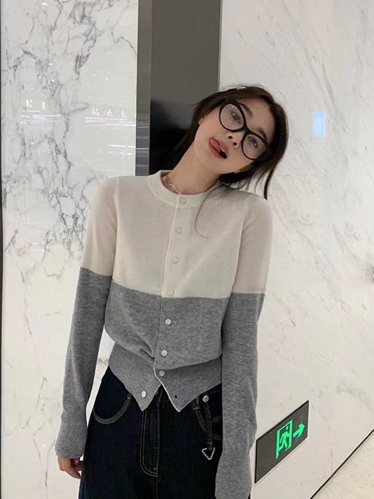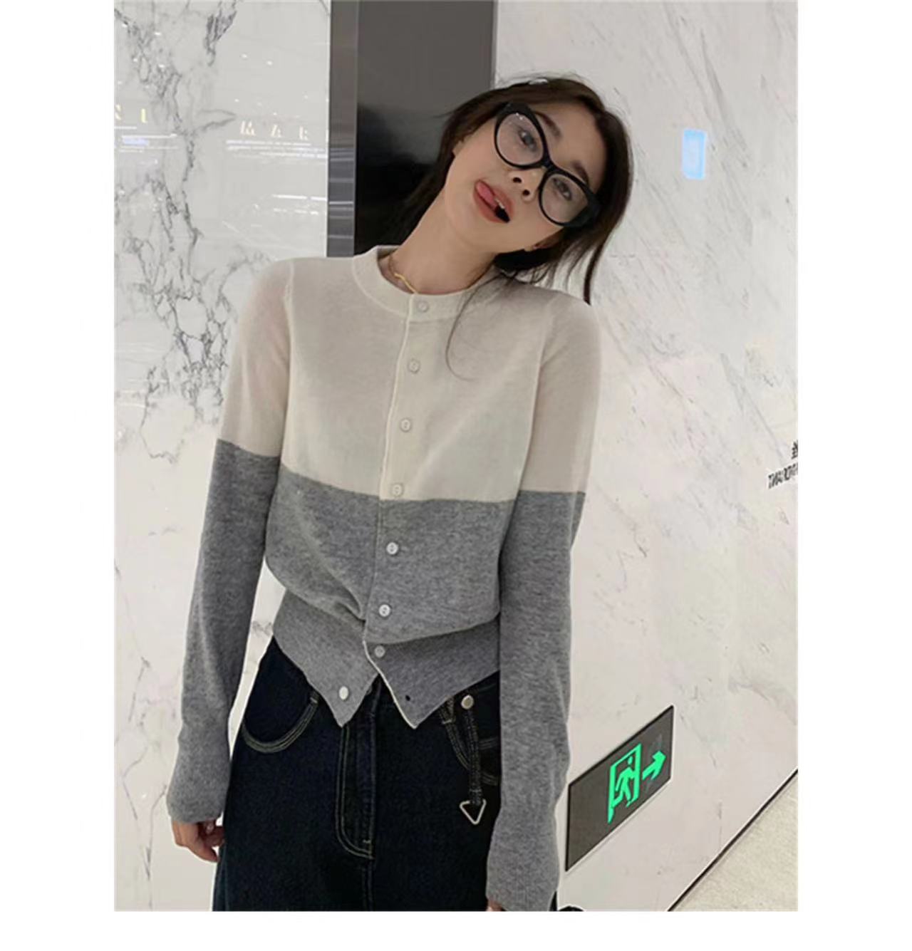 대비 색상 크루넥 울 니트 크루넥 가디건 여성용 틈새 스웨터 재킷 느슨한 모든 매치 긴팔 울 스웨터 탑