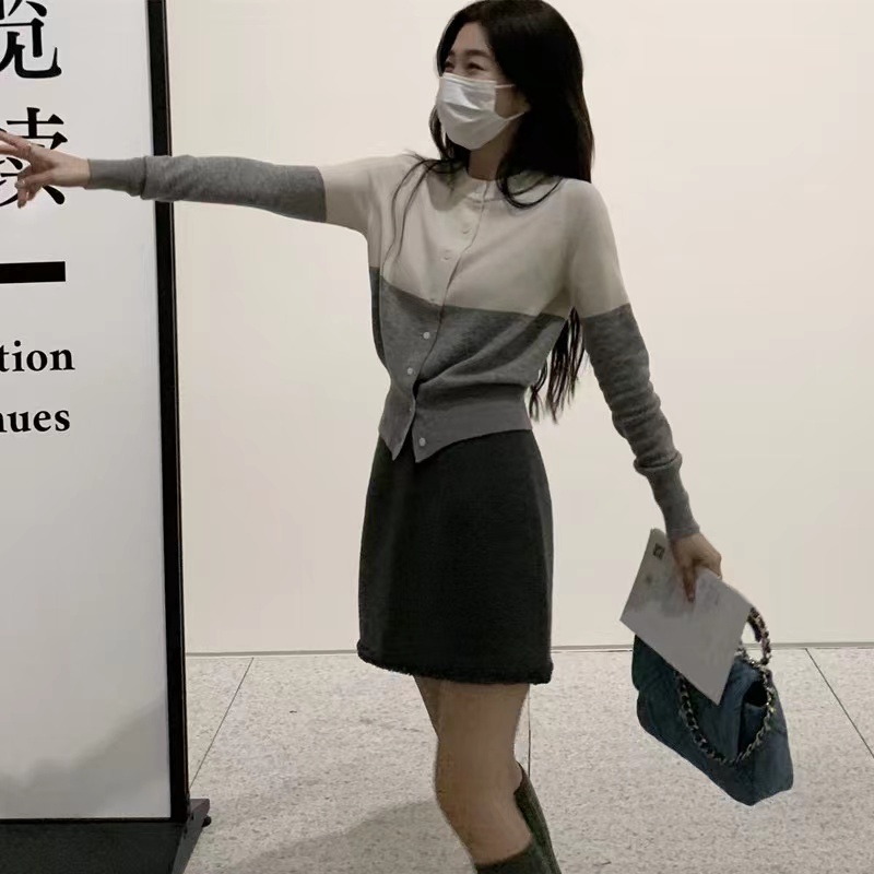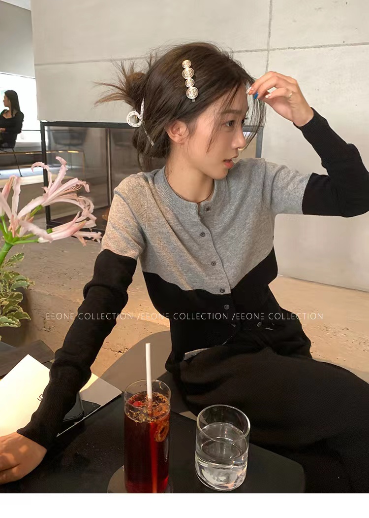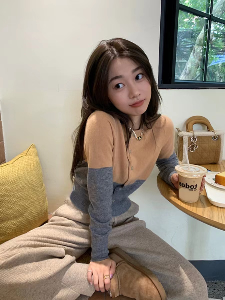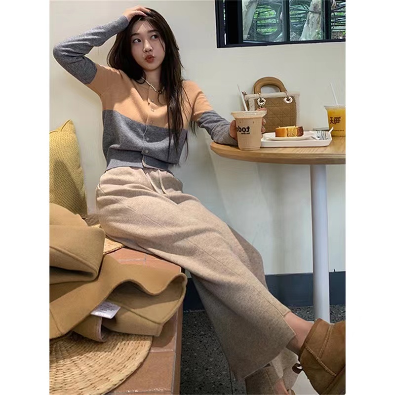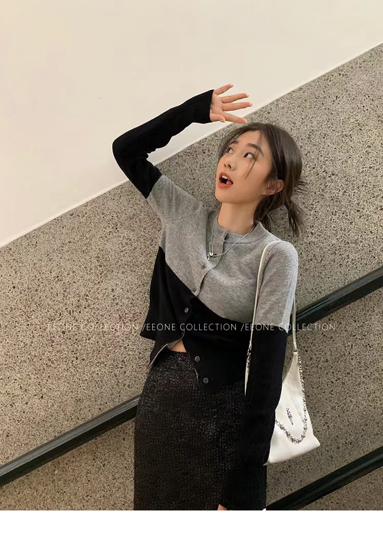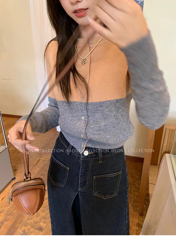 대비 색상 크루넥 울 니트 크루넥 가디건 여성용 틈새 스웨터 재킷 느슨한 모든 매치 긴팔 울 스웨터 탑