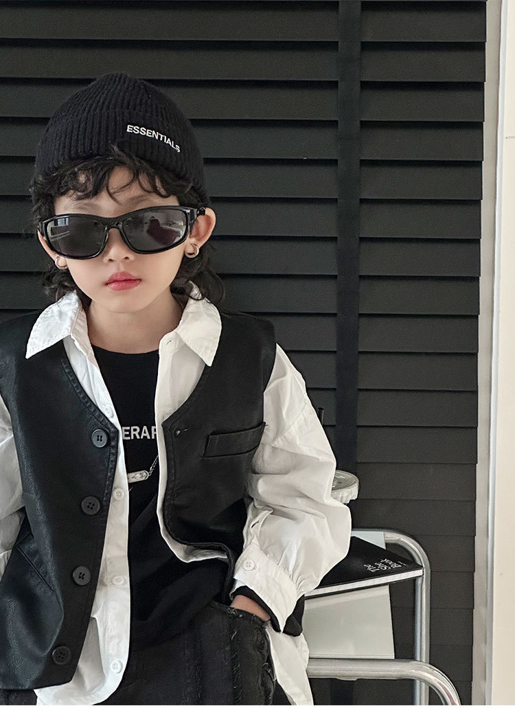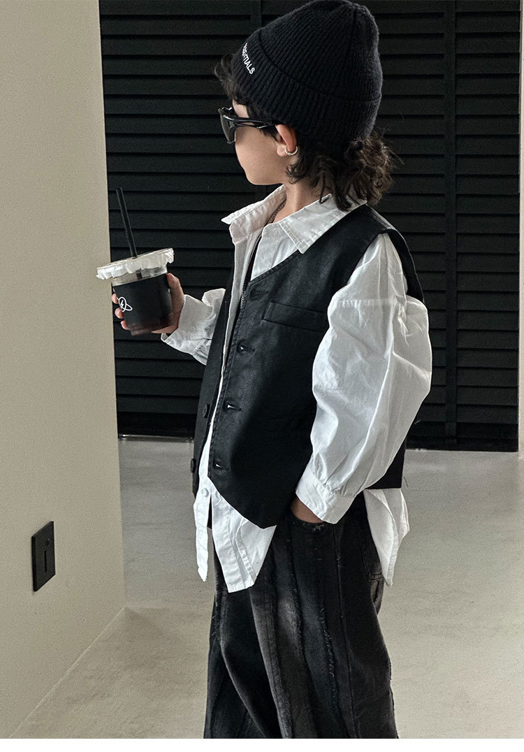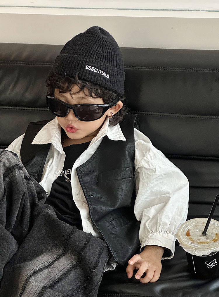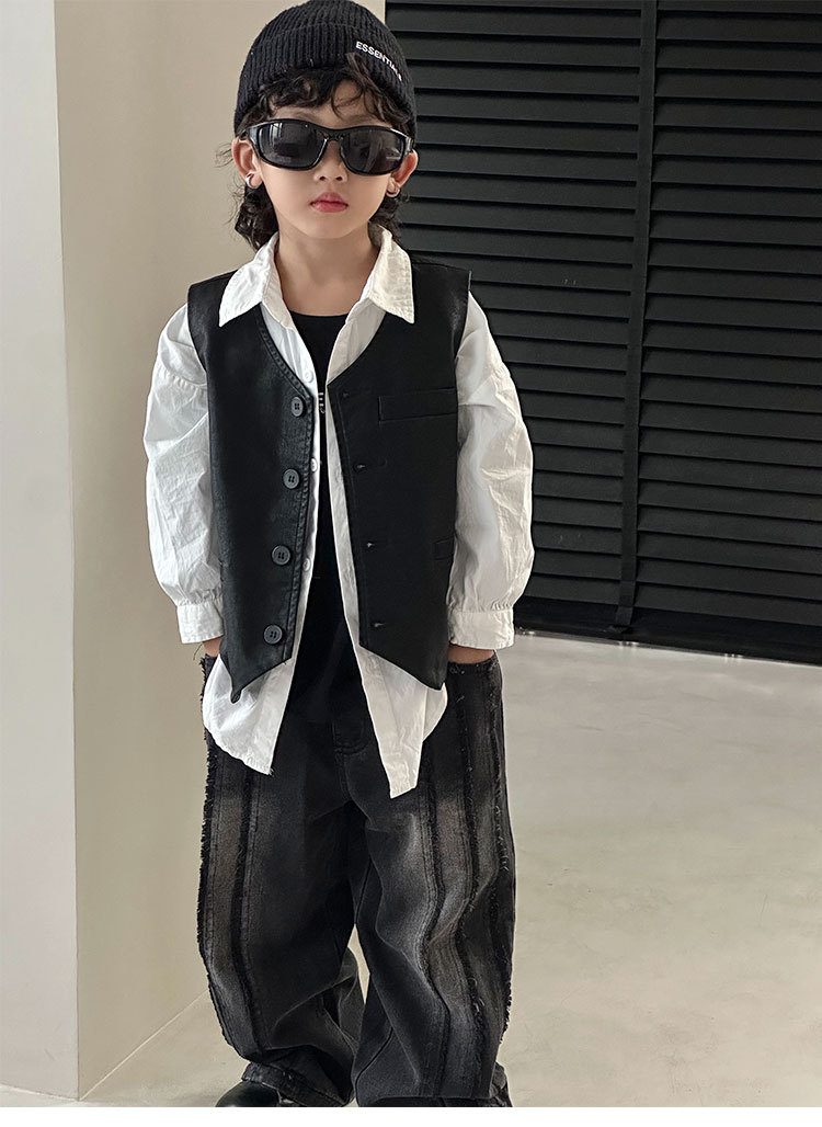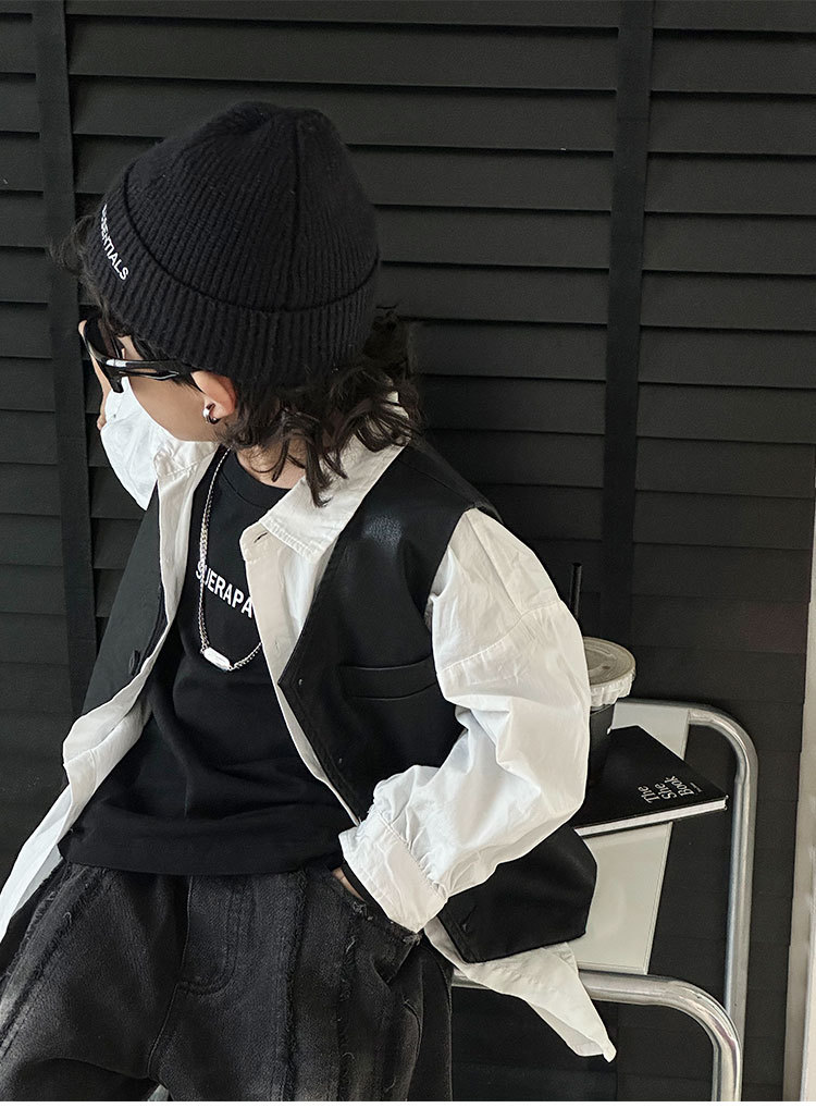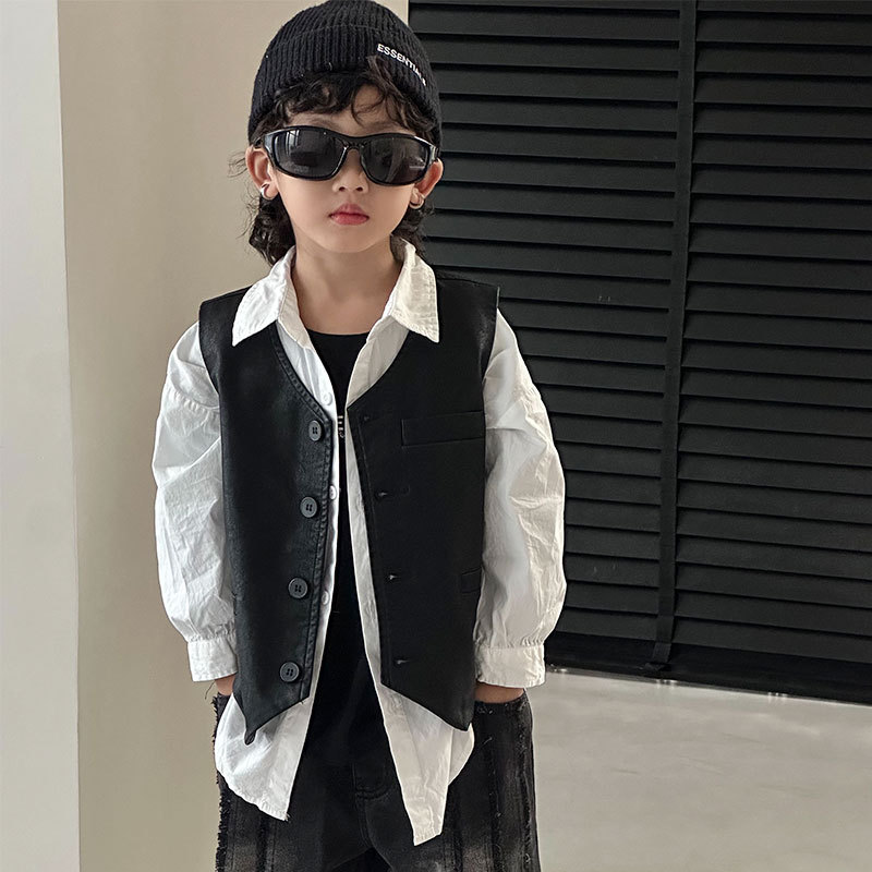 아동복 소년 가죽 조끼 2023 가을 새로운 PU 민소매 카디건 어린이 자켓 코트 한국어 버전의 세대