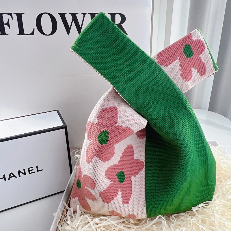 고급 자체 유지 레트로 대비 색상 핸드 니트 가방 손목 가방 한국식 고양이 가방 여성용 만능 핸드백