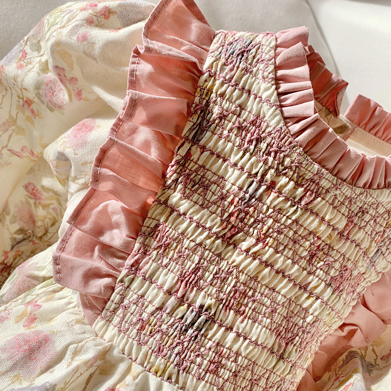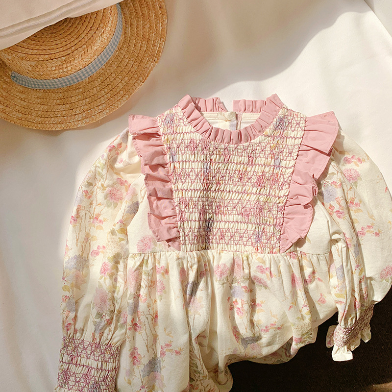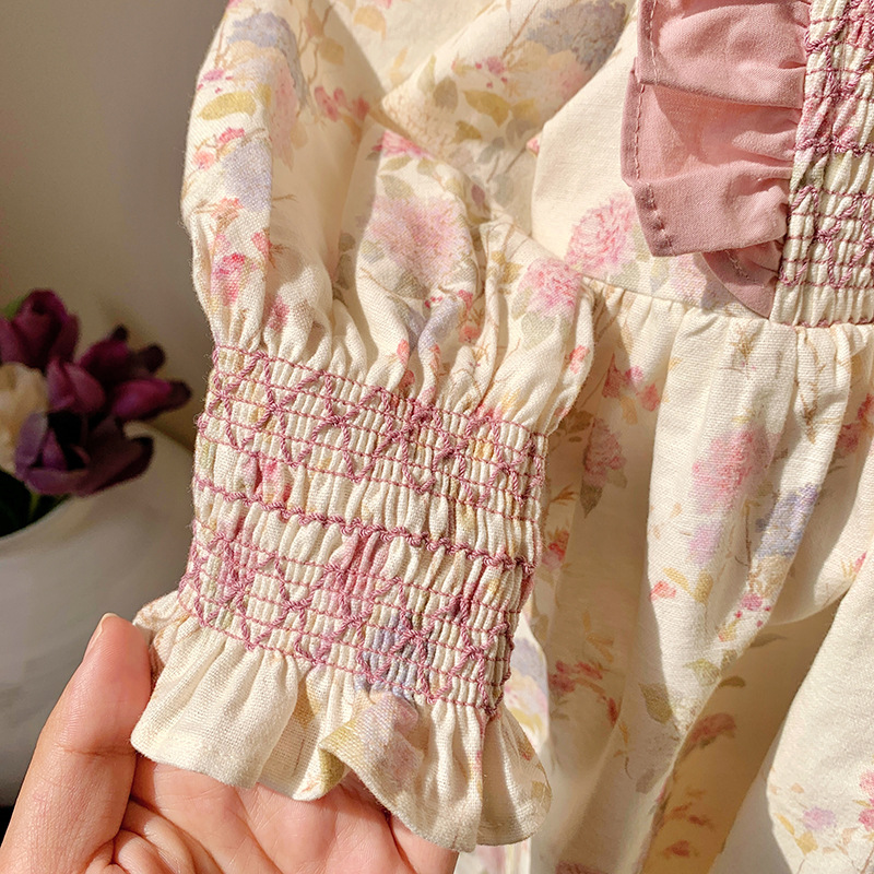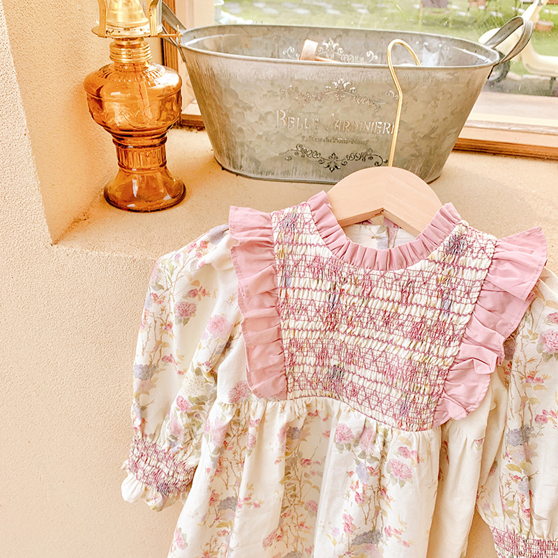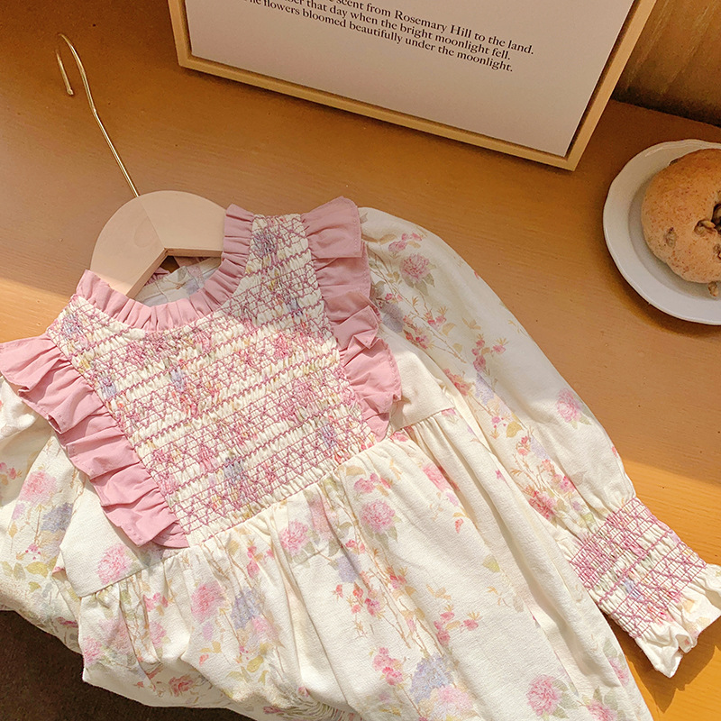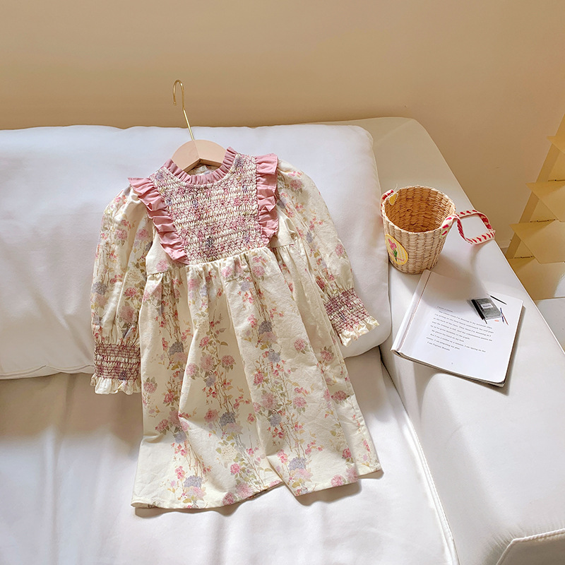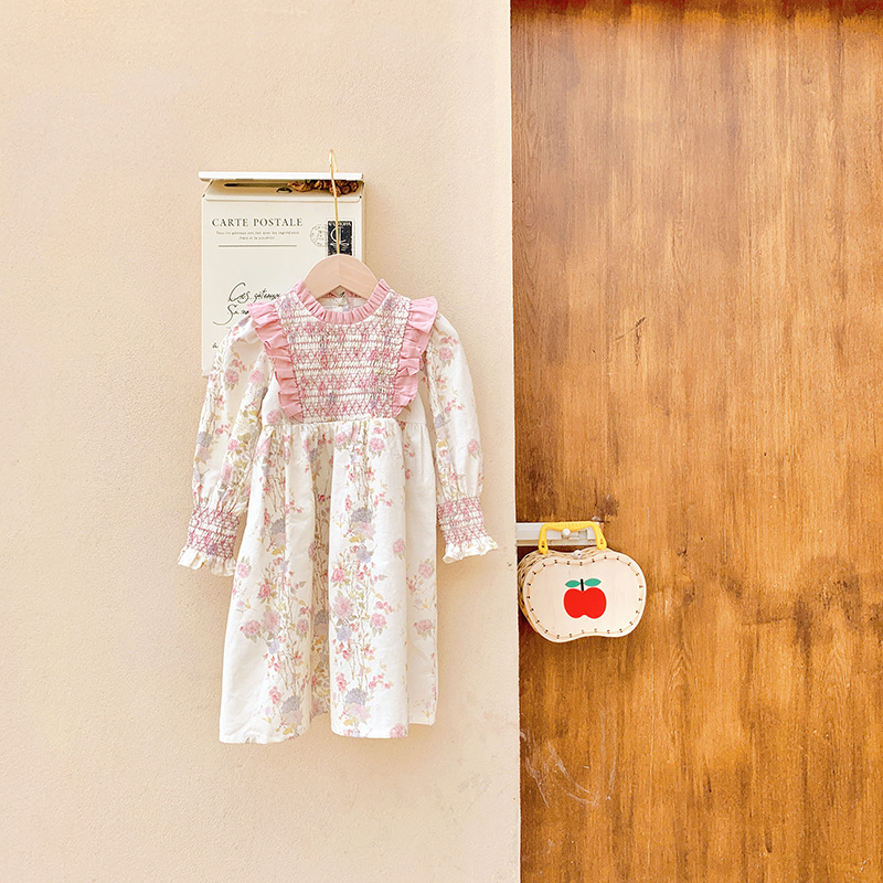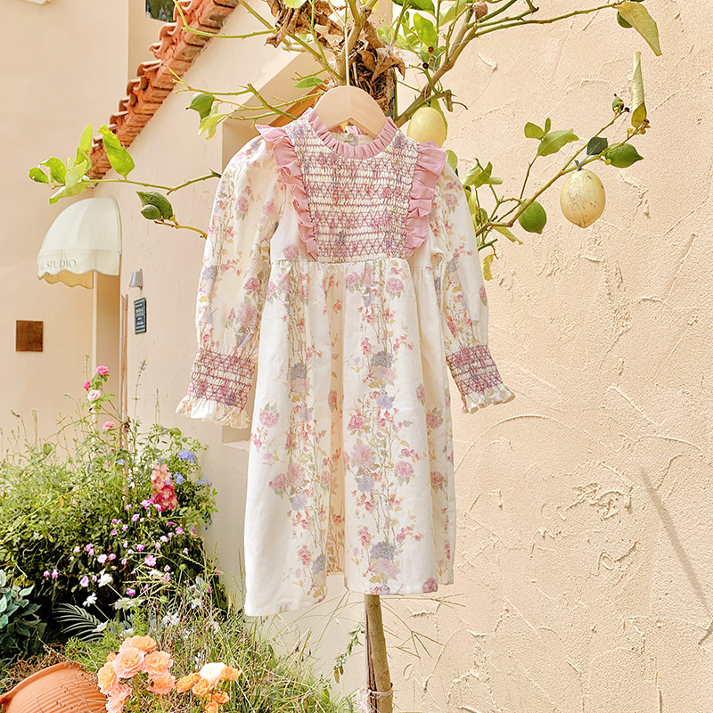 프렌치 스탠드 칼라 케이블 긴팔 소녀 드레스 2024 가을 한국 꽃 스타일 어린이 공주 드레스 도매
