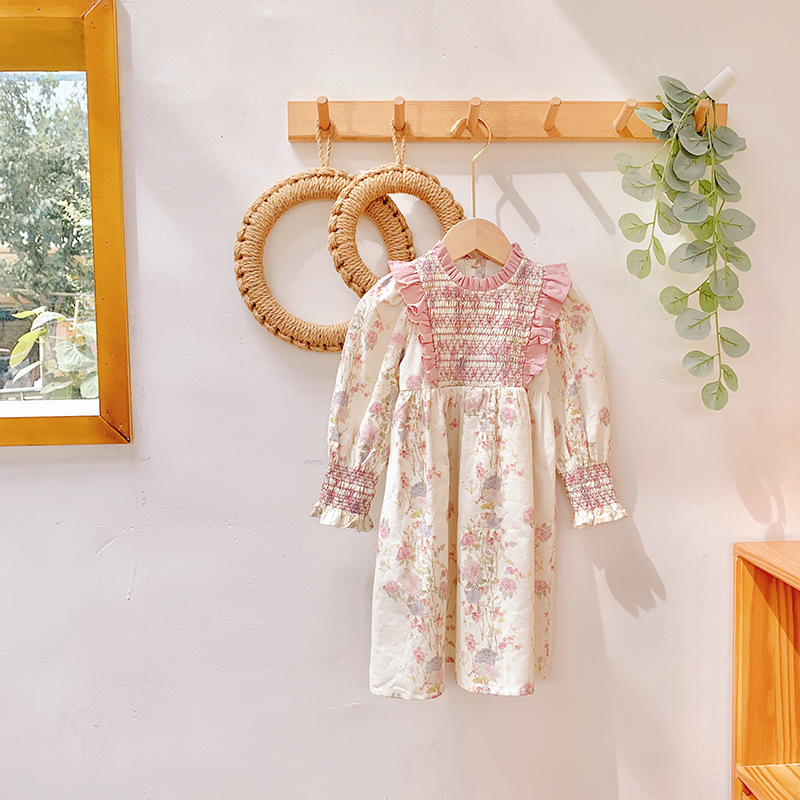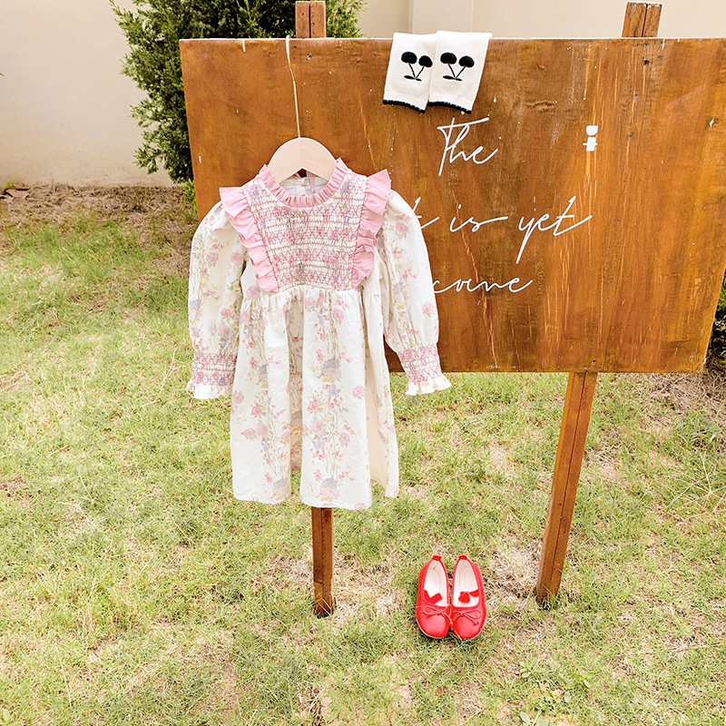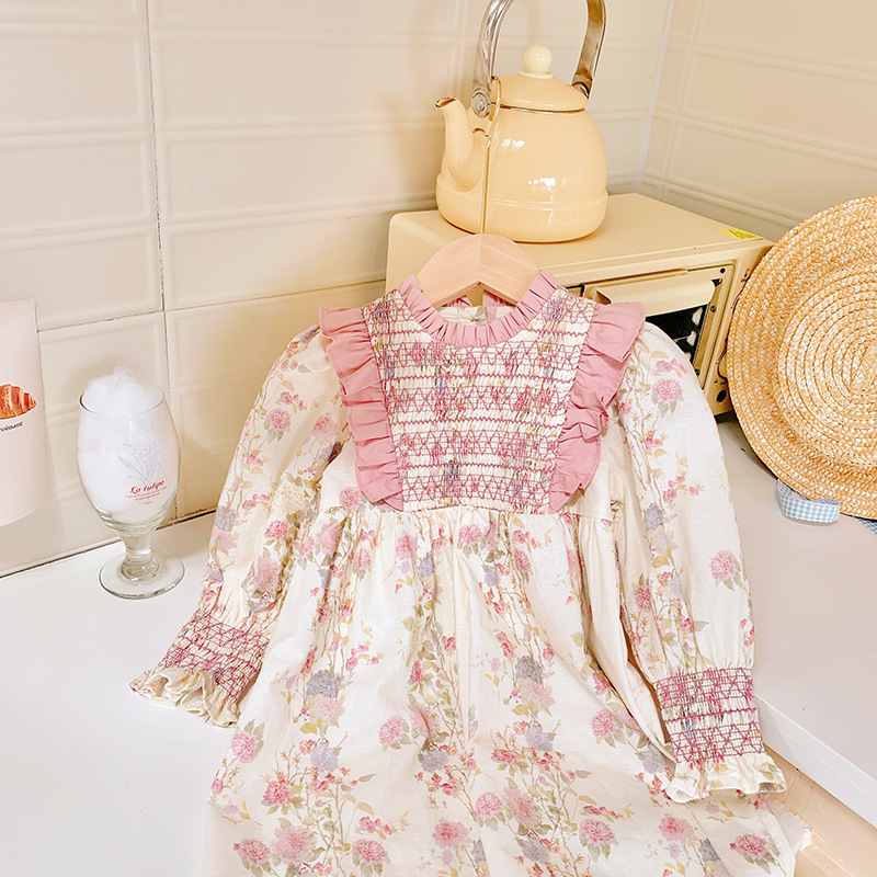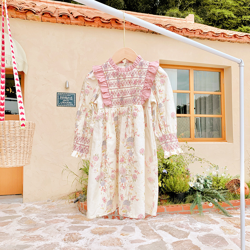 프렌치 스탠드 칼라 케이블 긴팔 소녀 드레스 2024 가을 한국 꽃 스타일 어린이 공주 드레스 도매스토어 가기