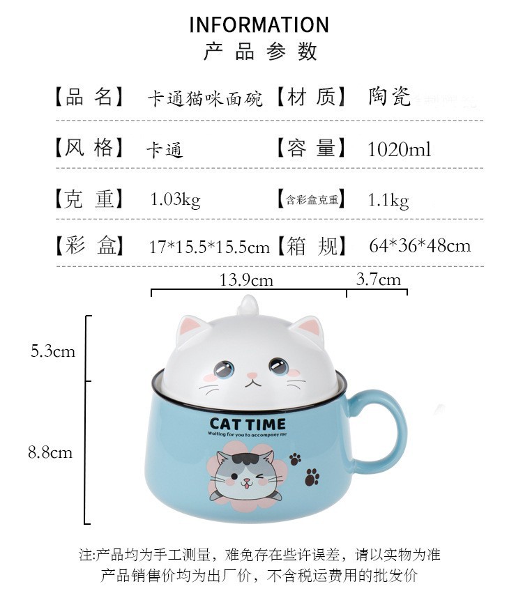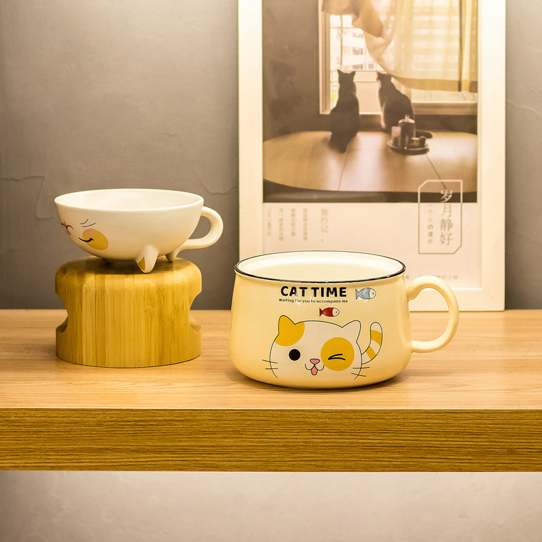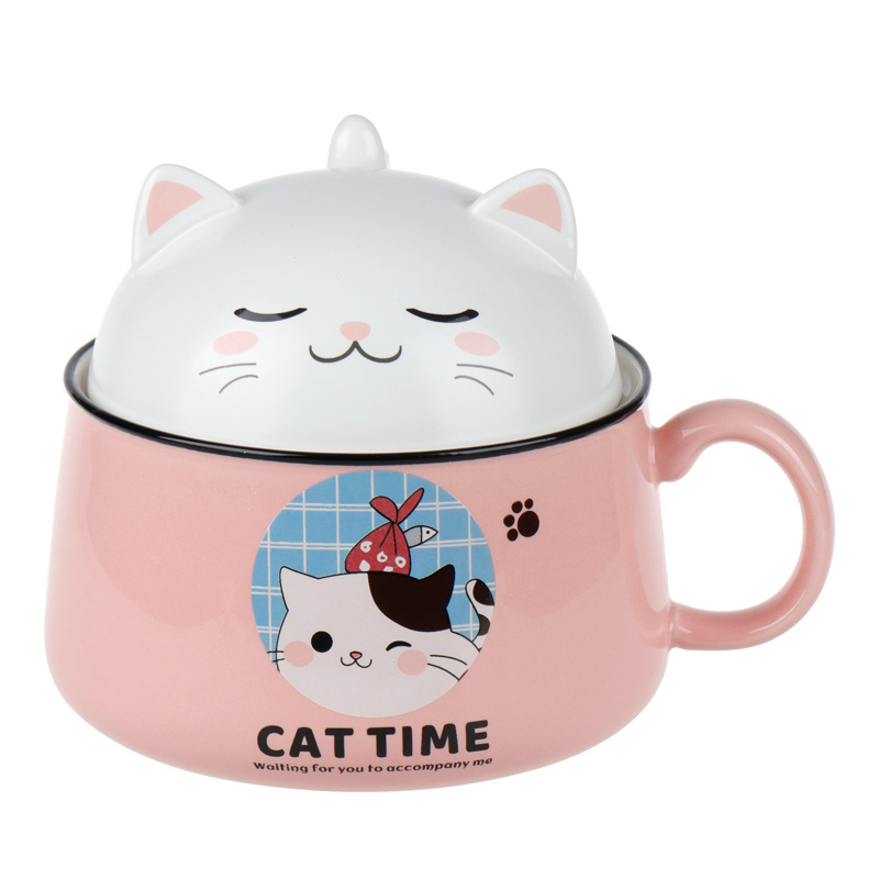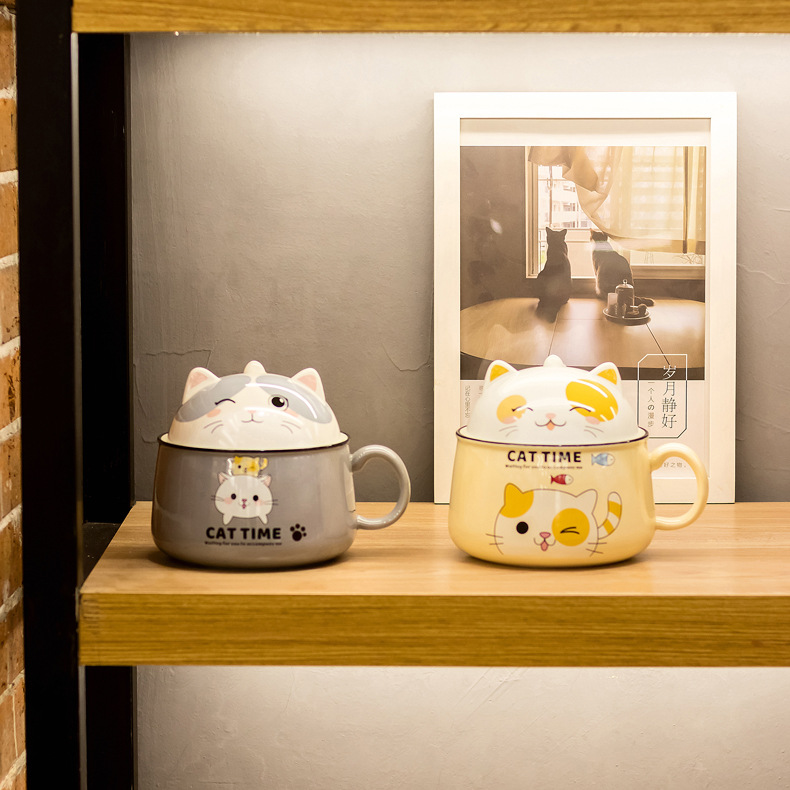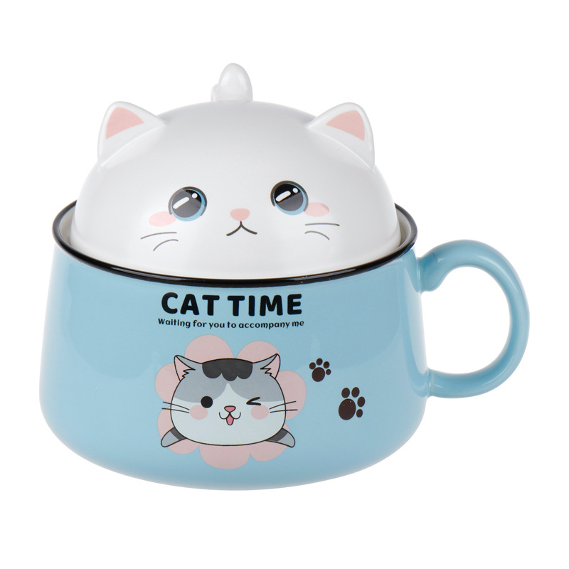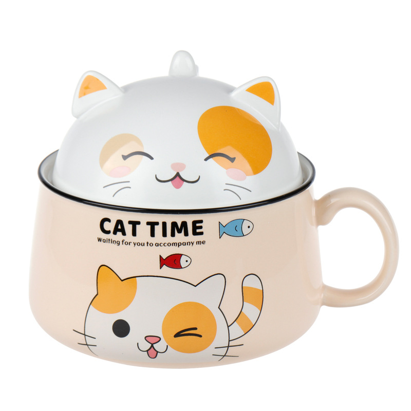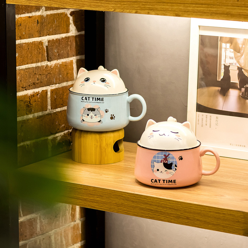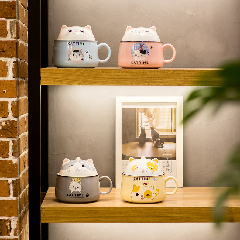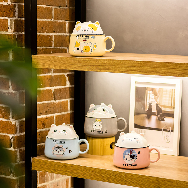 만화 세라믹 인스턴트 국수 그릇 뚜껑 그릇 높은 색상 가치 사무실 고양이 창조적 인 아침 식사 컵 손 선물 손잡이 도자기 그릇스토어 가기