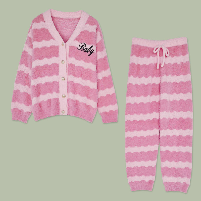 달콤한 수제 자수 샤넬 스타일 모조 밍크 스트라이프 잠옷 여성의 가을과 겨울 따뜻한 부드러운 겉옷 가정복