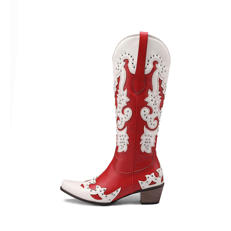 2023 가을과 겨울 크로스 보더 부츠 리벳 컬러 스티칭 하이 웨스턴 부츠 두꺼운 굽 미들 힐 34-43 여성용 대형 신발