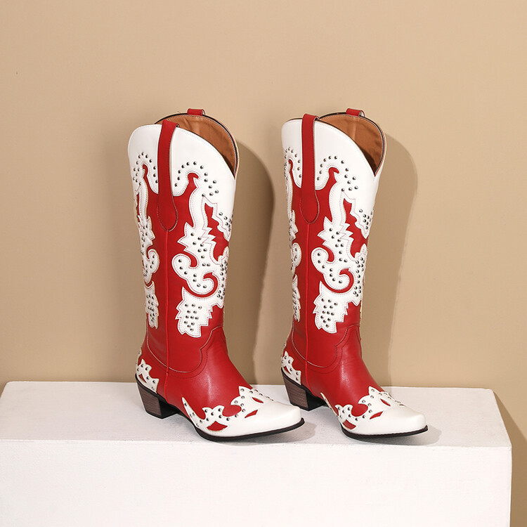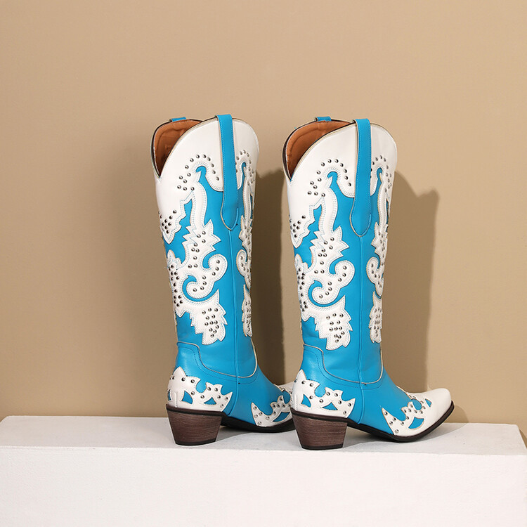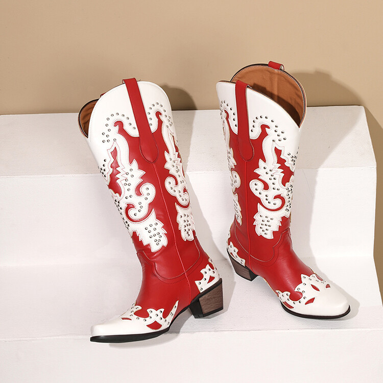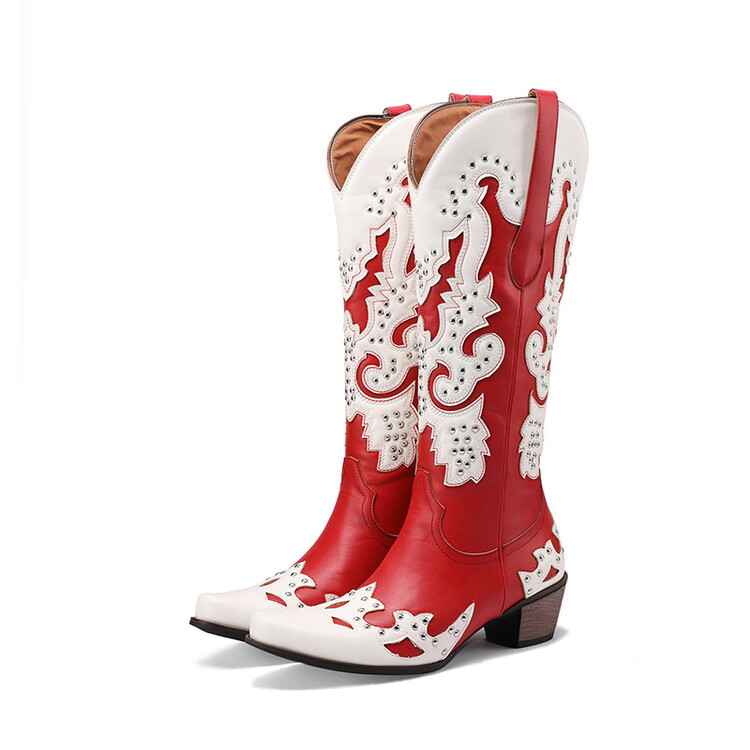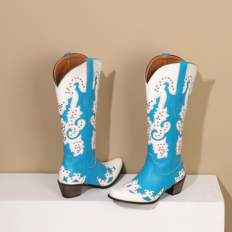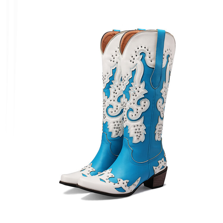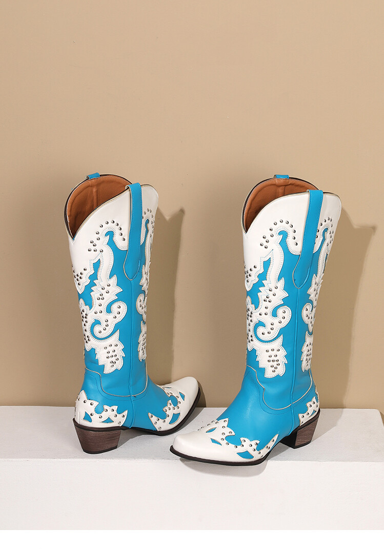 2023 가을과 겨울 크로스 보더 부츠 리벳 컬러 스티칭 하이 웨스턴 부츠 두꺼운 굽 미들 힐 34-43 여성용 대형 신발스토어 가기