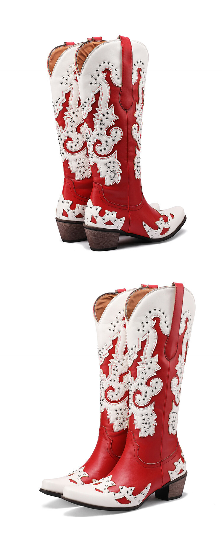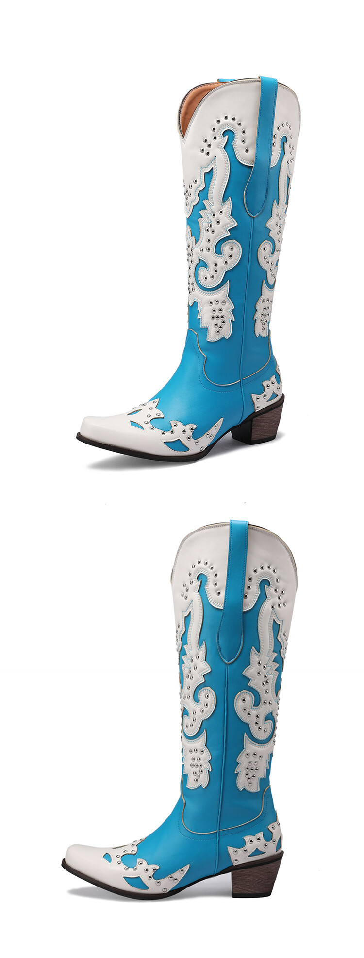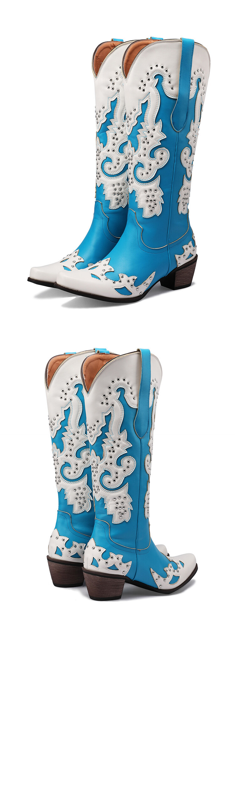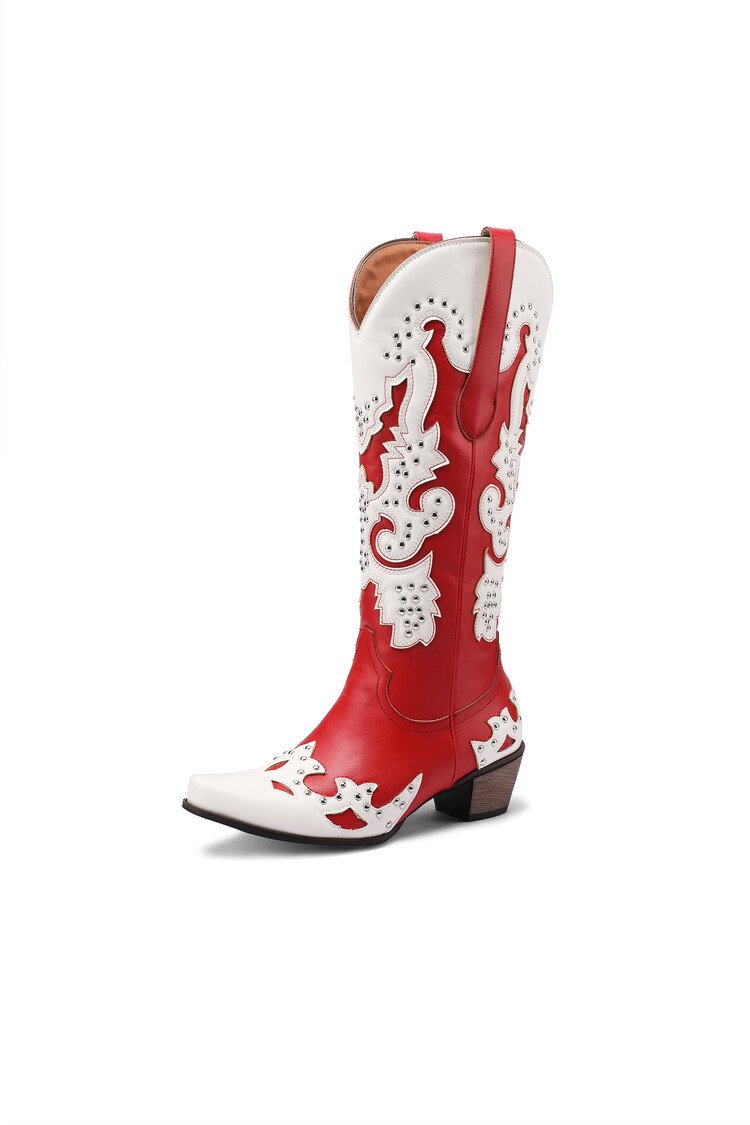 2023 가을과 겨울 크로스 보더 부츠 리벳 컬러 스티칭 하이 웨스턴 부츠 두꺼운 굽 미들 힐 34-43 여성용 대형 신발스토어 가기
