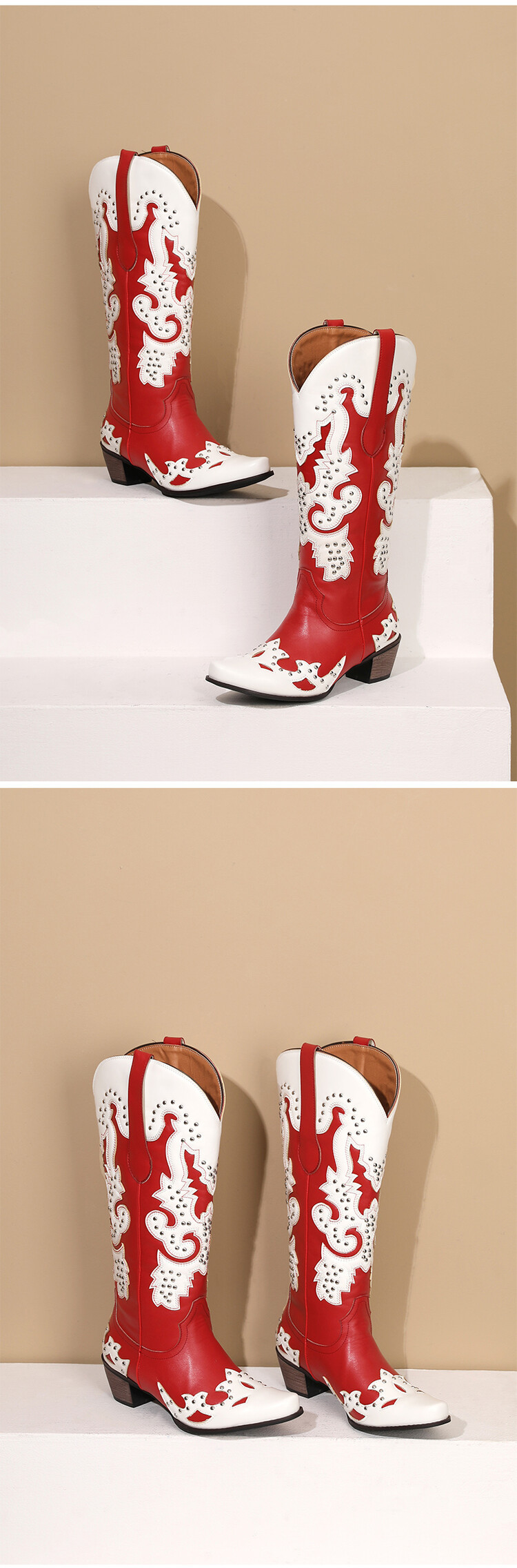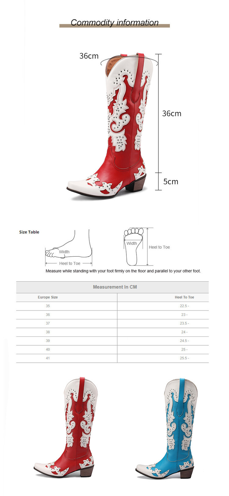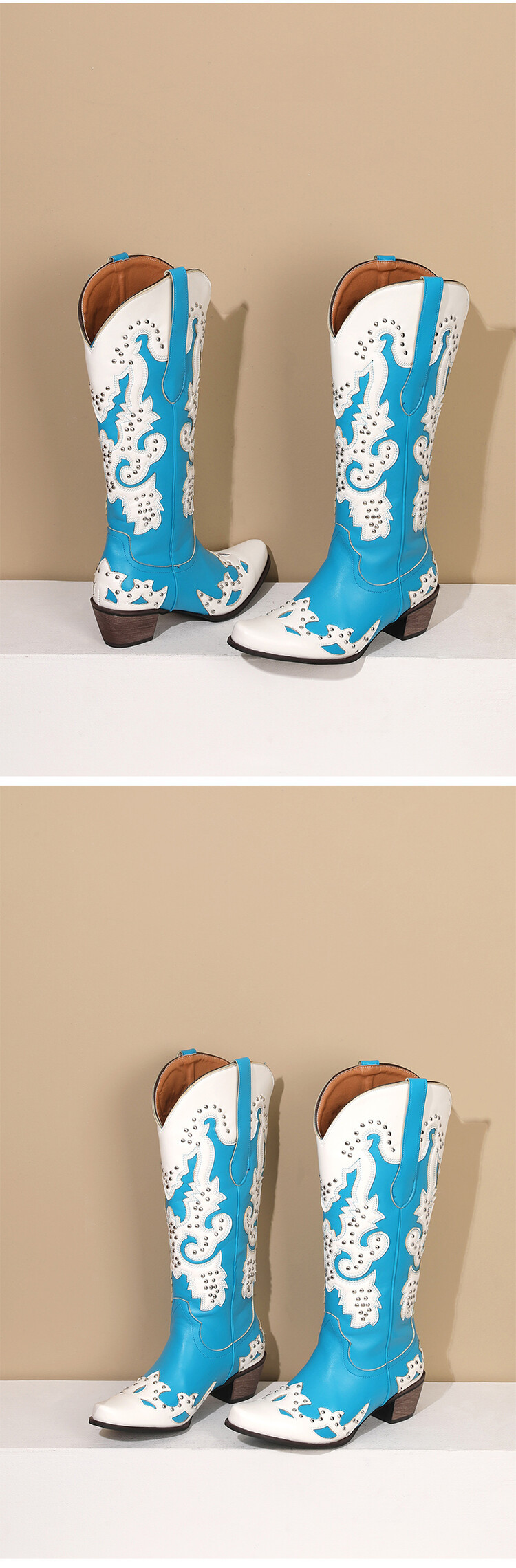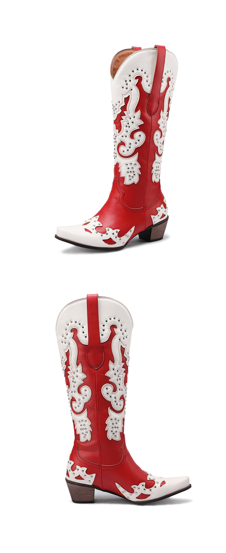 2023 가을과 겨울 크로스 보더 부츠 리벳 컬러 스티칭 하이 웨스턴 부츠 두꺼운 굽 미들 힐 34-43 여성용 대형 신발스토어 가기