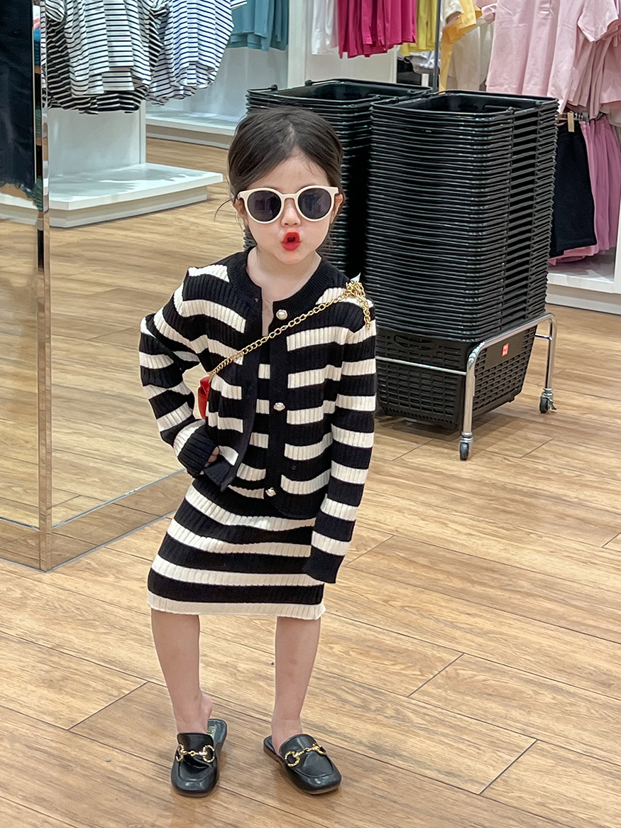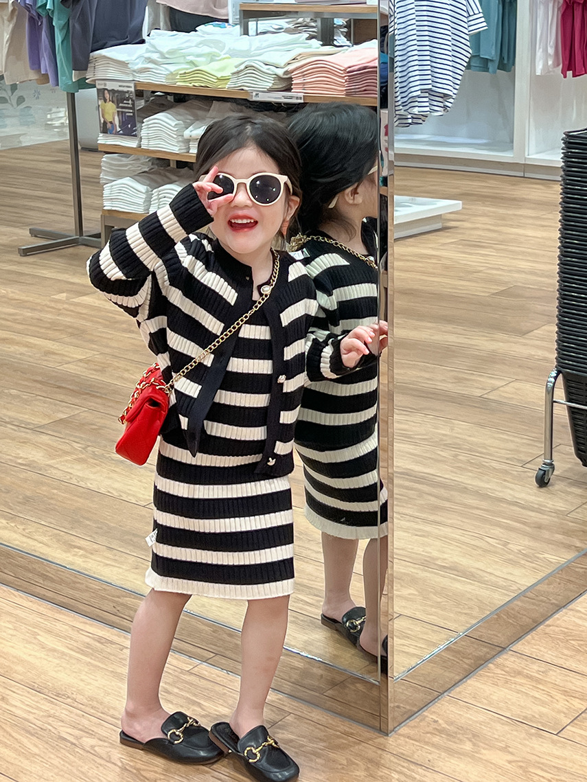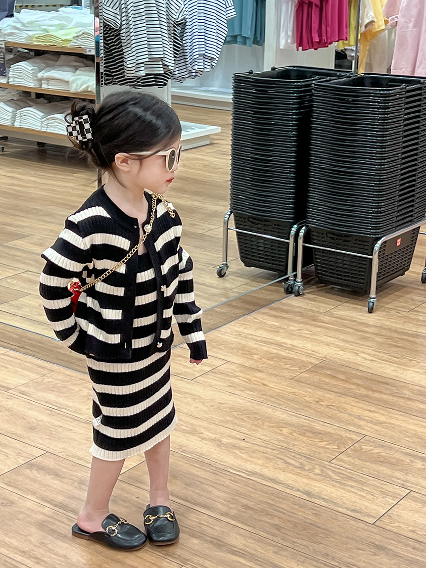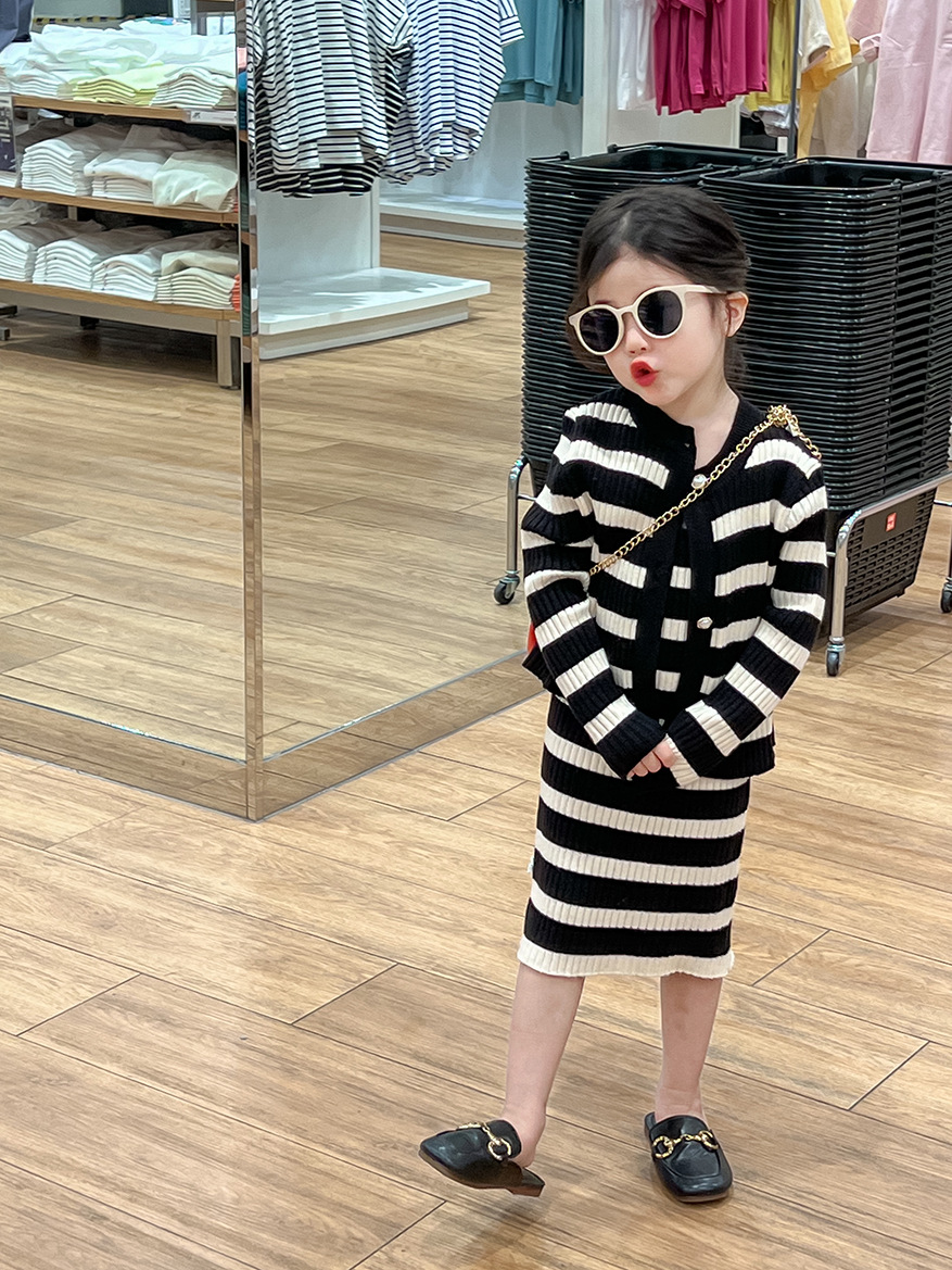 여아 스웨터 세트 25 봄, 가을 신상 니트 스웨터 아동 스트라이프 서스펜더 스커트 + 스트라이프 가디건 투피스 세트스토어 가기