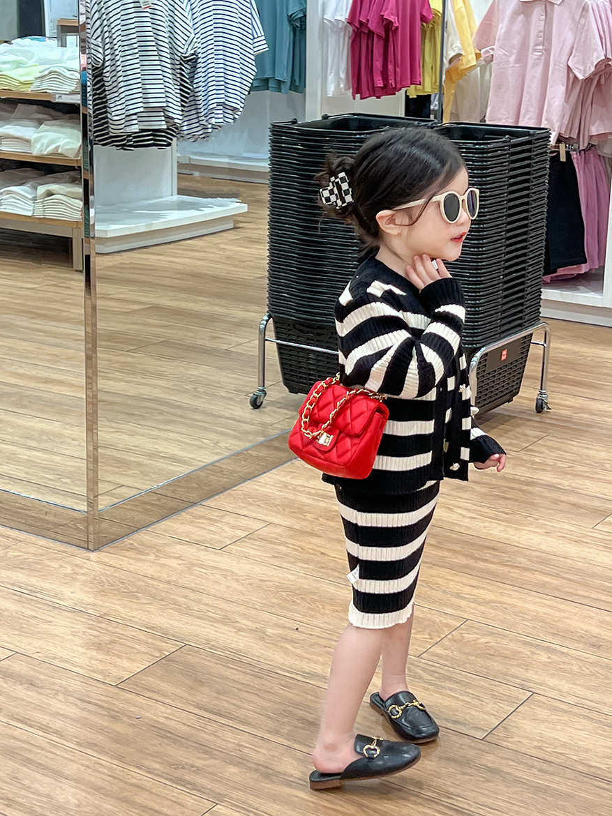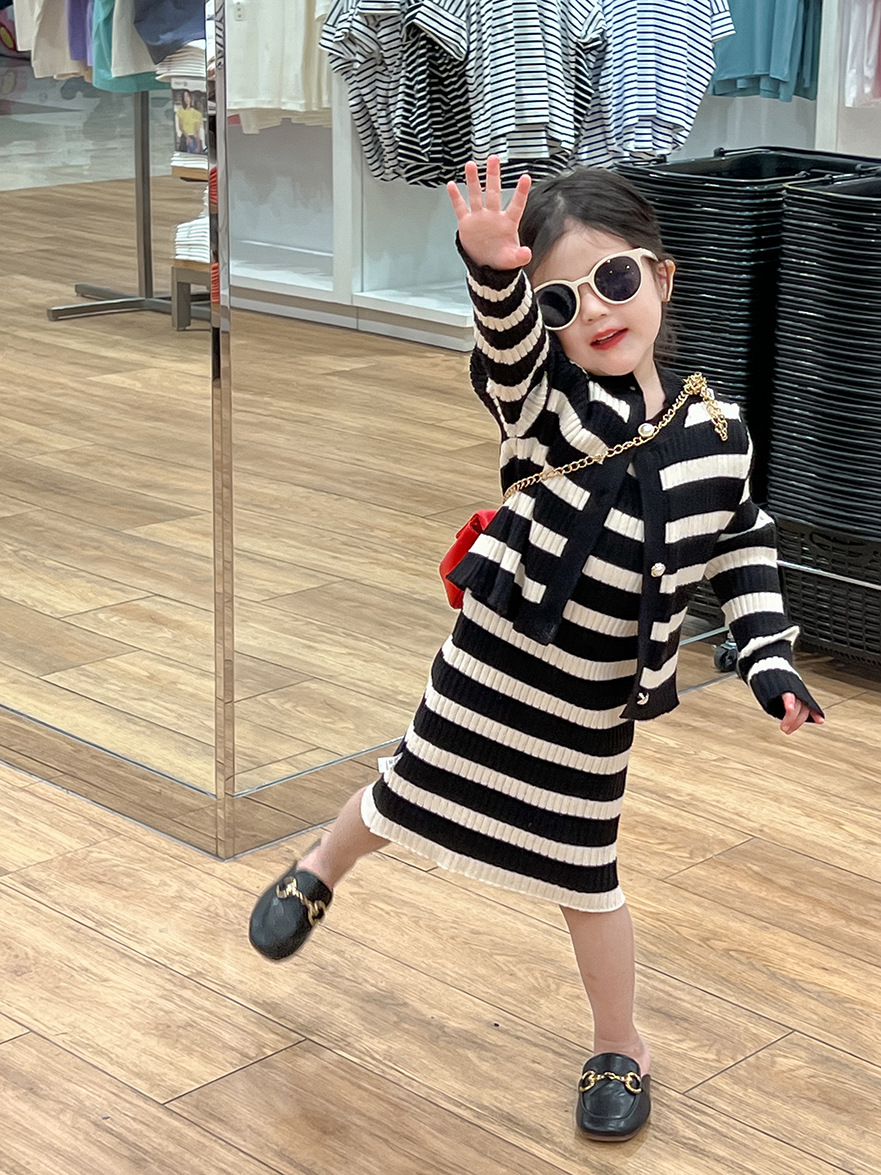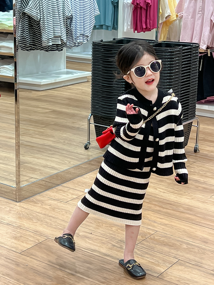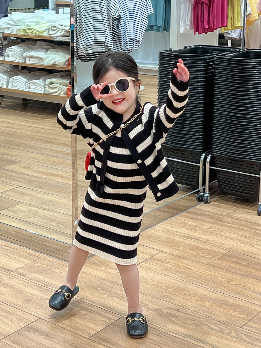 여아 스웨터 세트 25 봄, 가을 신상 니트 스웨터 아동 스트라이프 서스펜더 스커트 + 스트라이프 가디건 투피스 세트스토어 가기