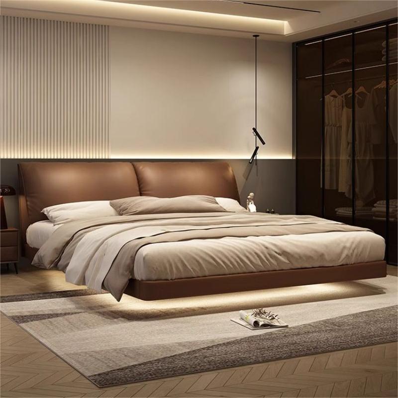 意式极简悬浮大象耳朵现代简约真皮床主卧轻奢羽绒软包带灯双人床