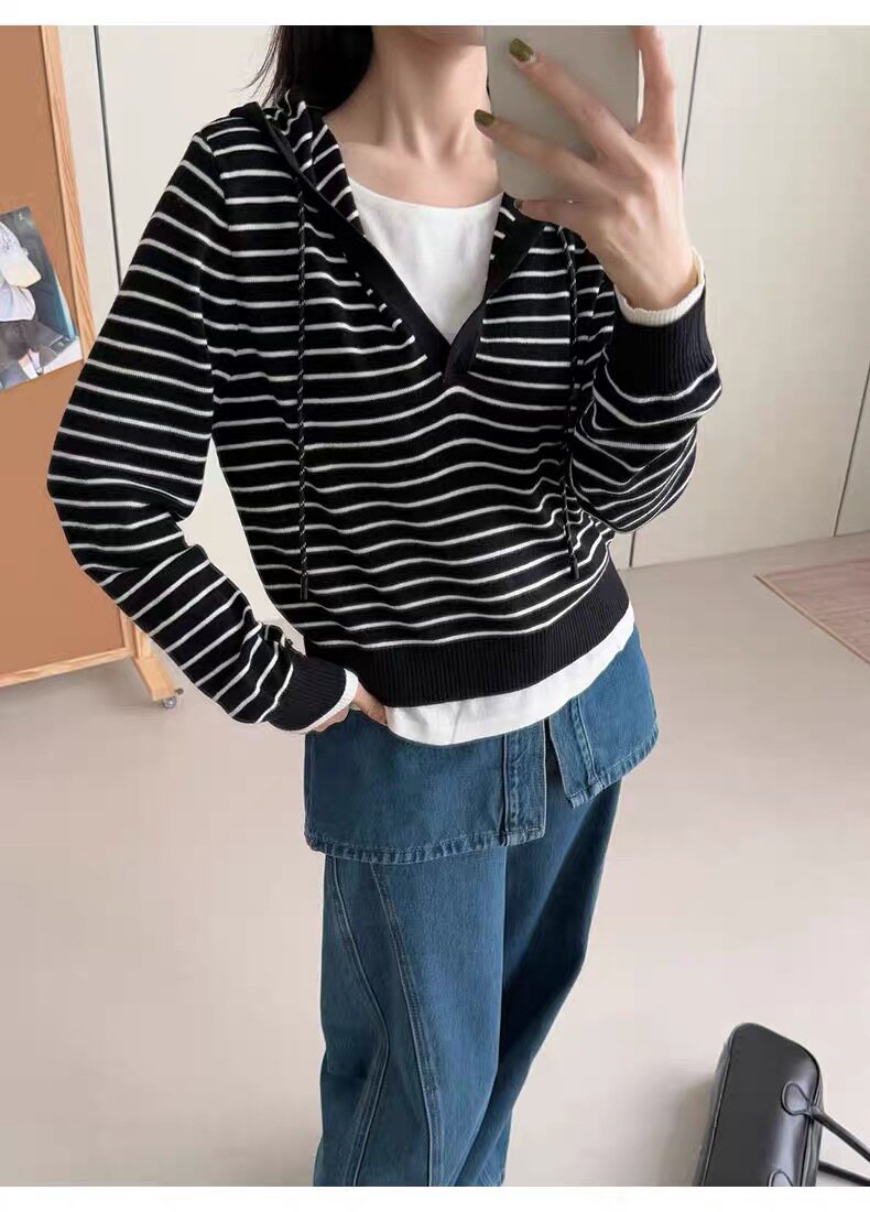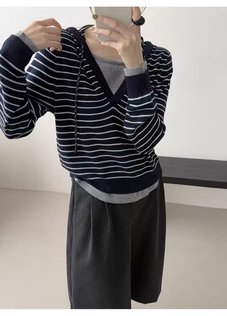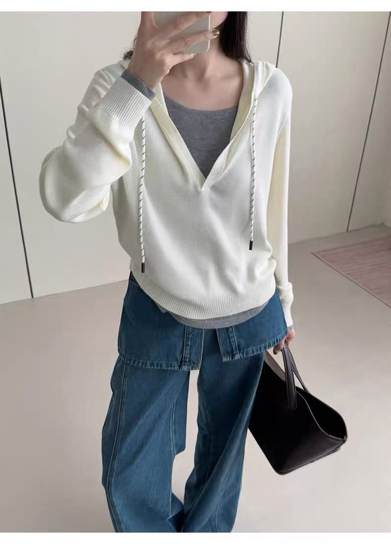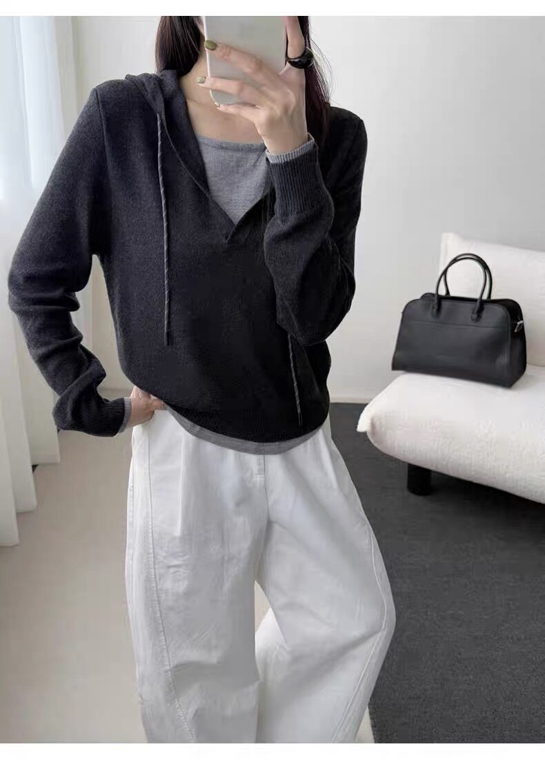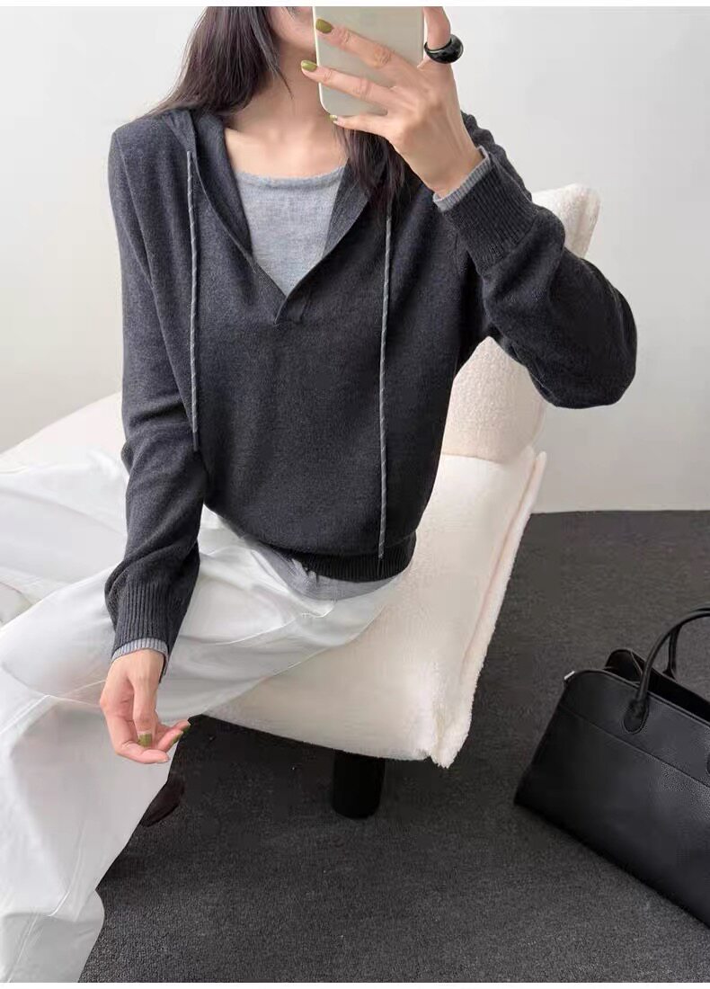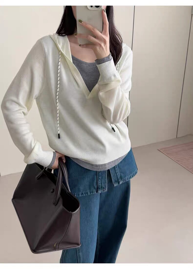 배색 드로스트링 후드 페이크 투피스 니트 여성 2026 가을 신상 루즈핏 슬림 긴팔 상의스토어 가기