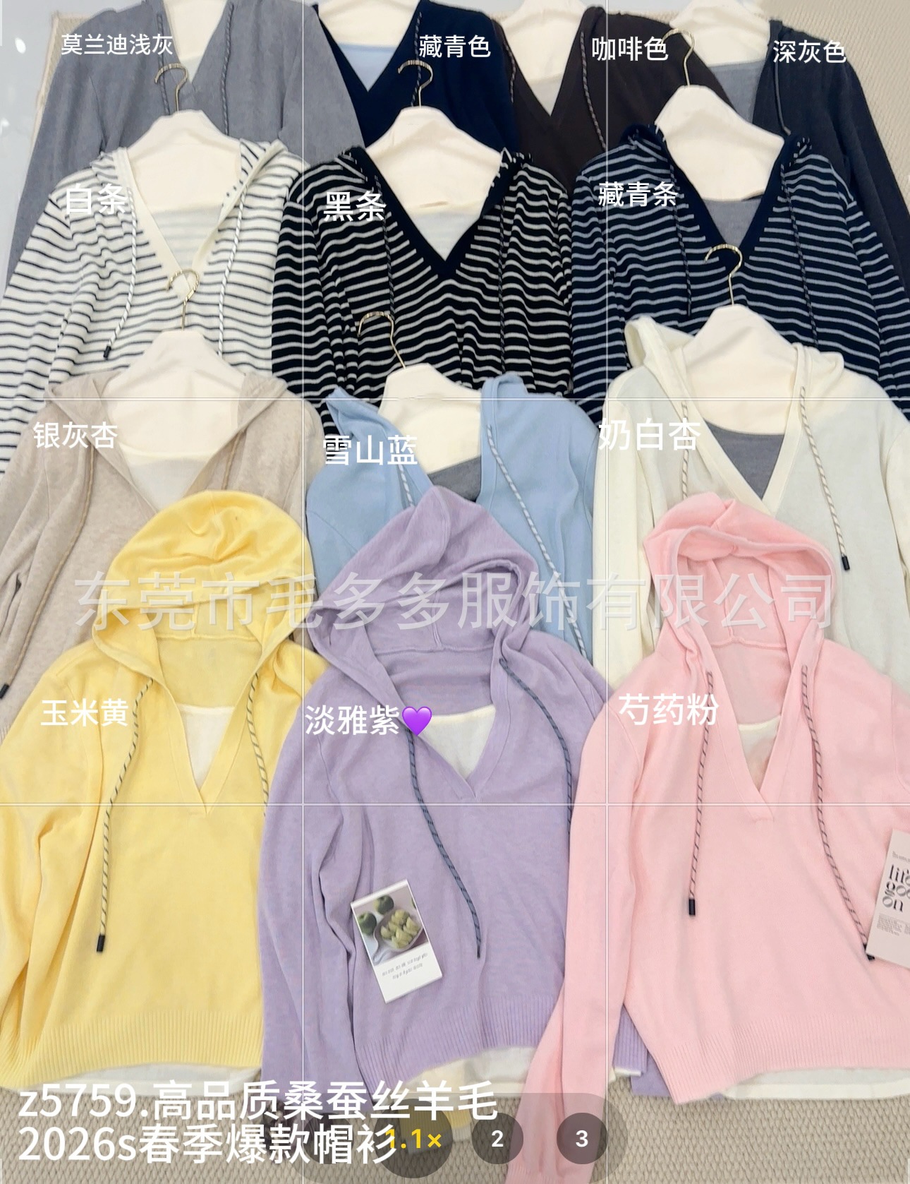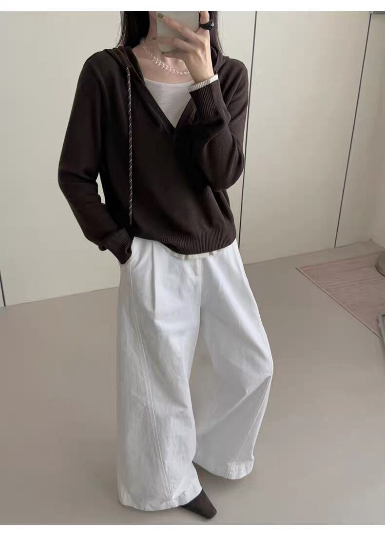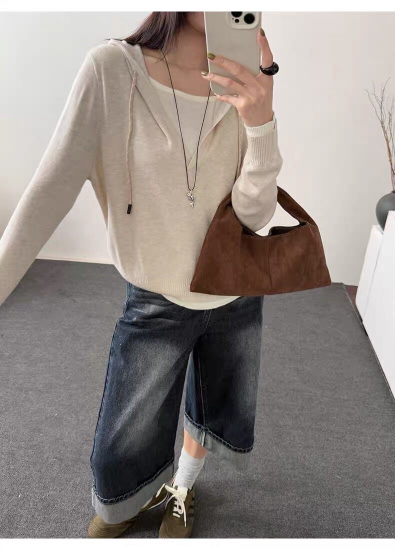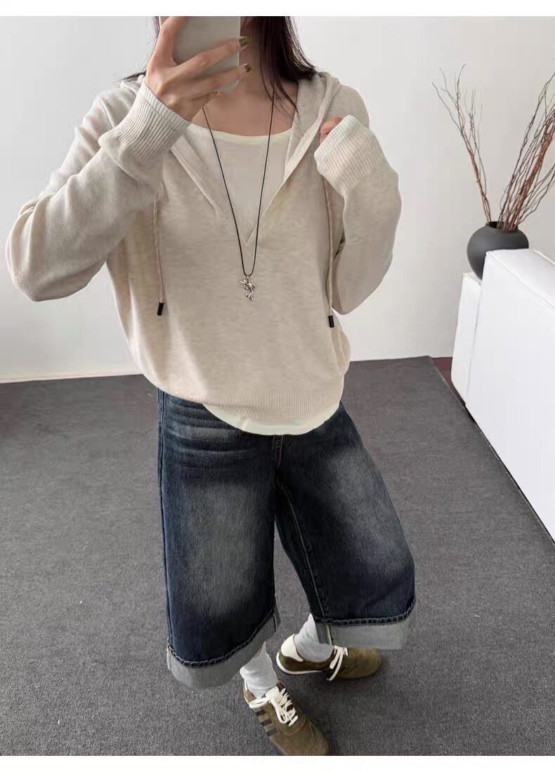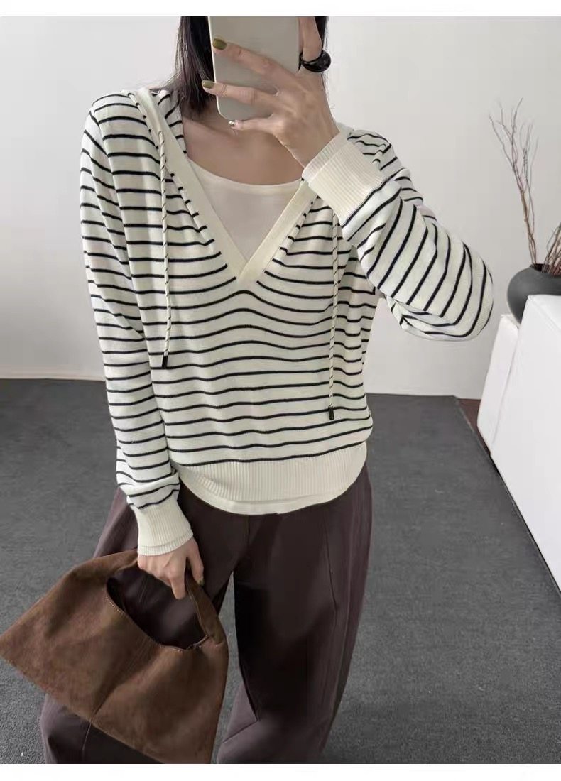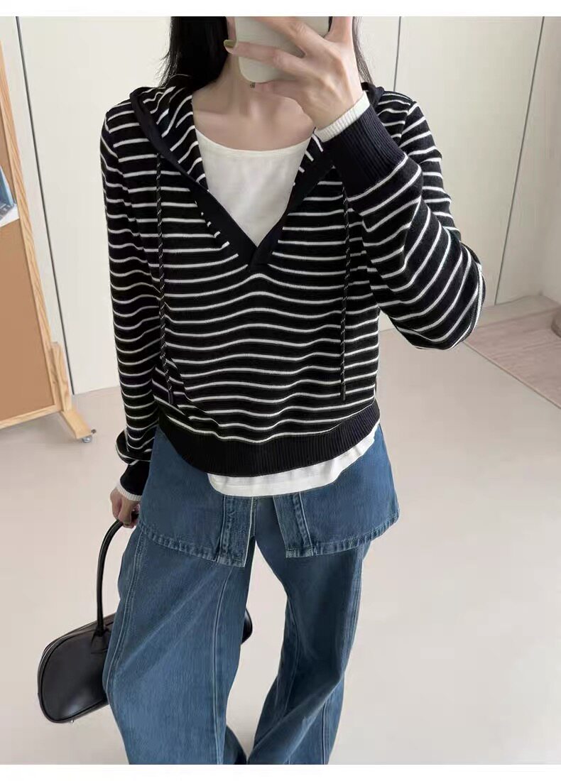 배색 드로스트링 후드 페이크 투피스 니트 여성 2026 가을 신상 루즈핏 슬림 긴팔 상의스토어 가기