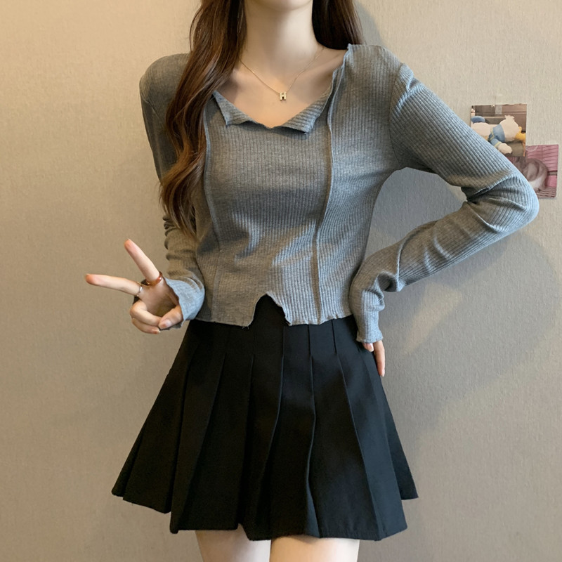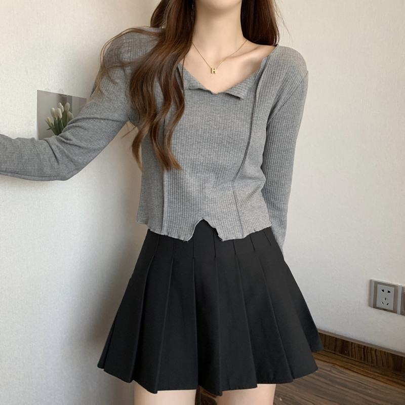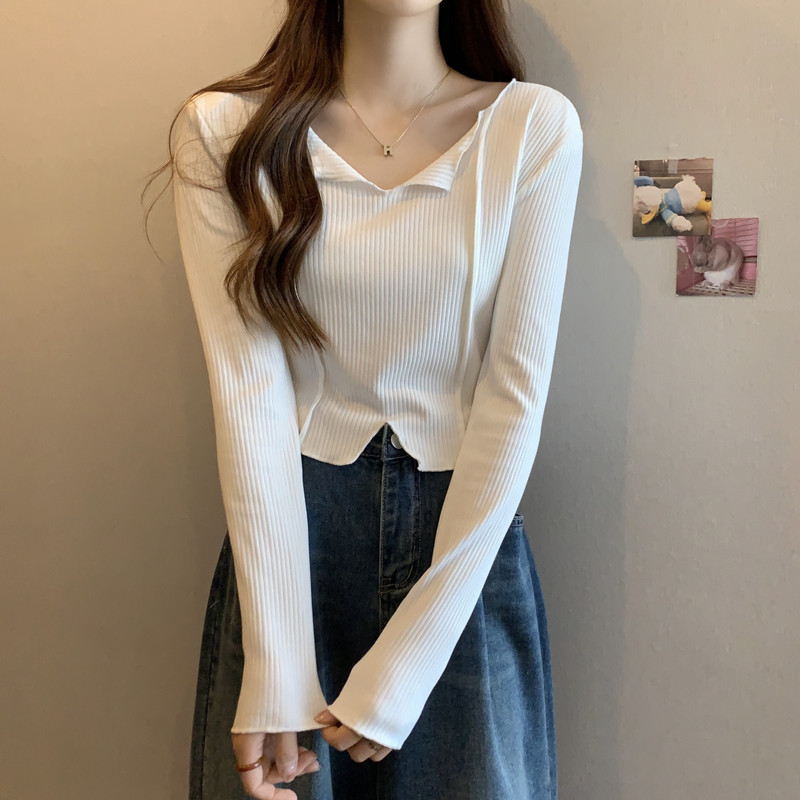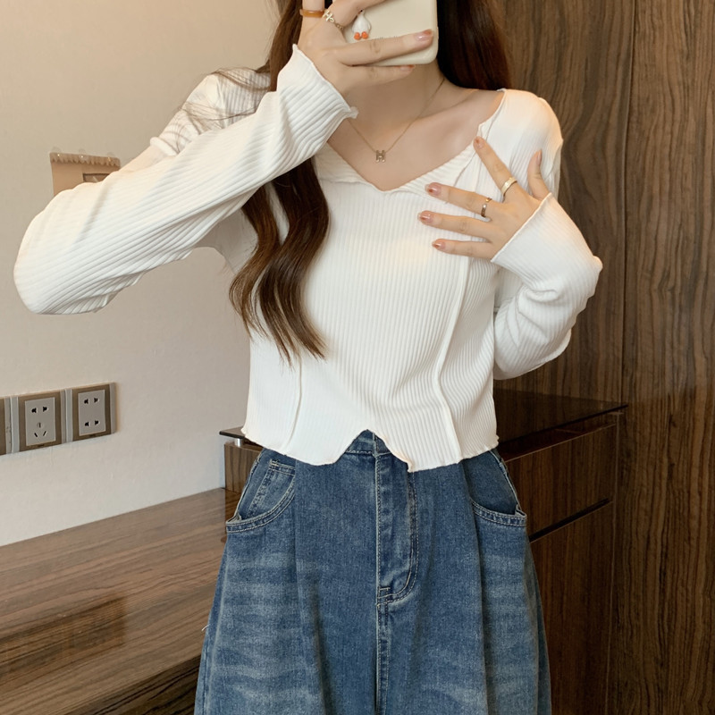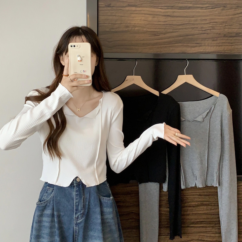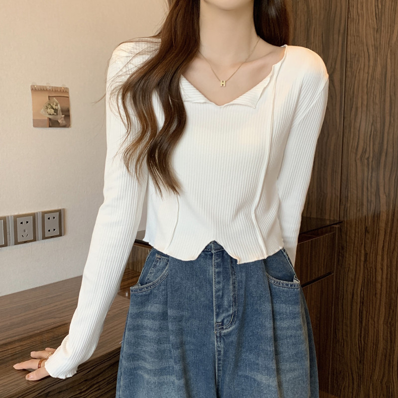 쇄골 라인 V넥 이너웨어 긴팔 여성 디자인 감각이 돋보이는 유니크한 숏 스타일 학생 니트 상의 2025 가을 트렌드스토어 가기