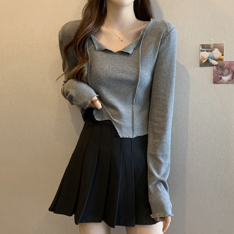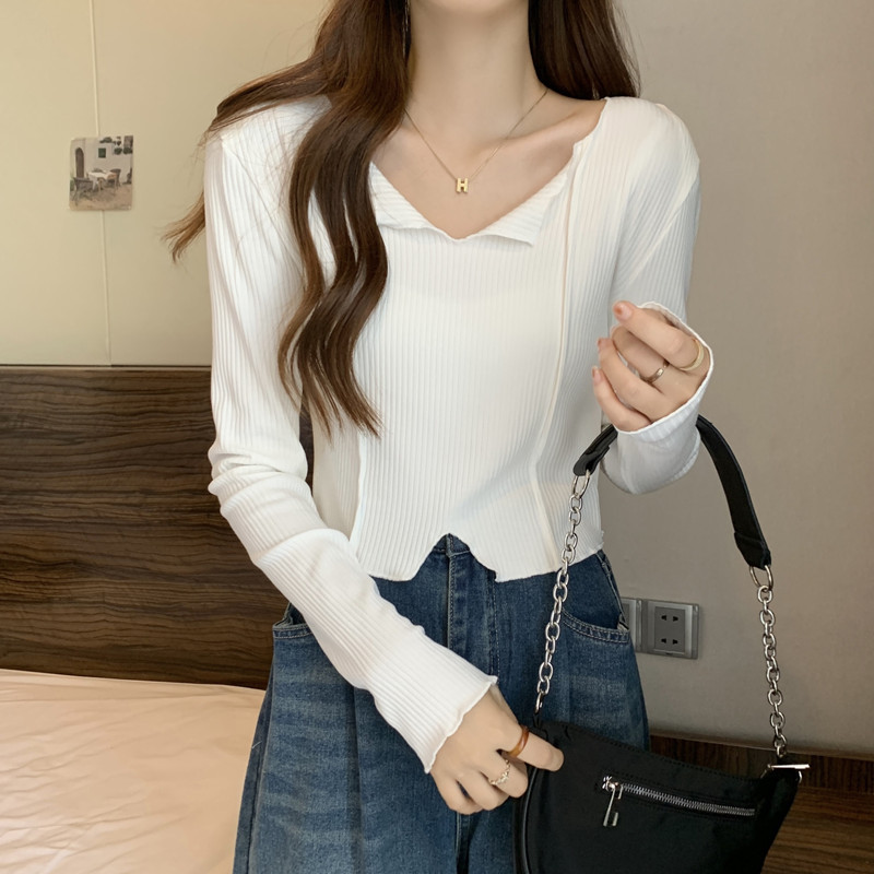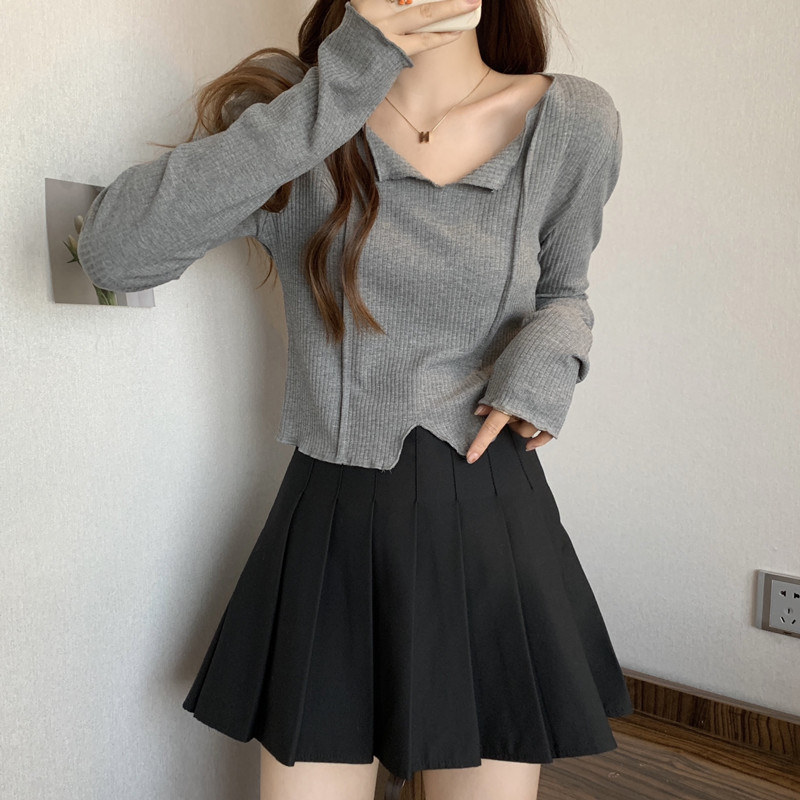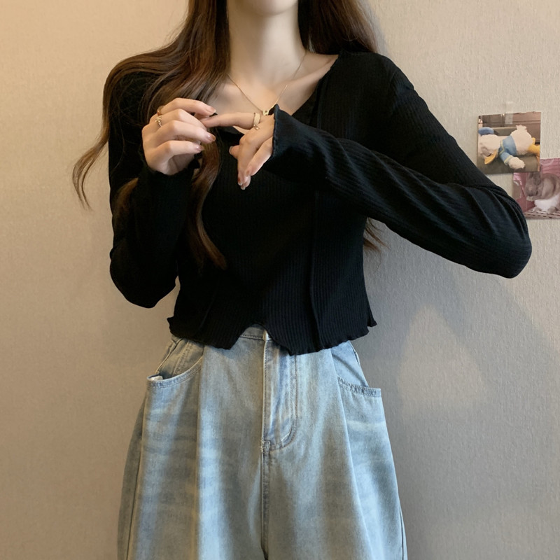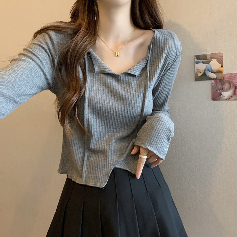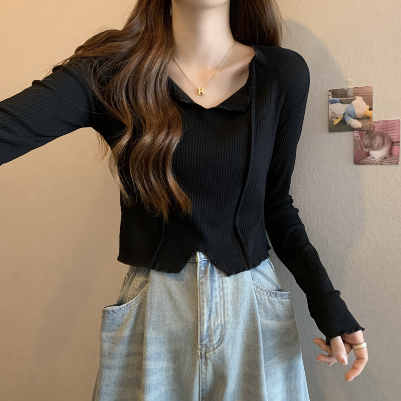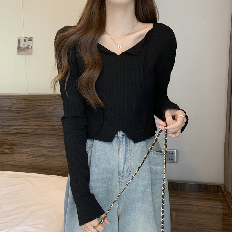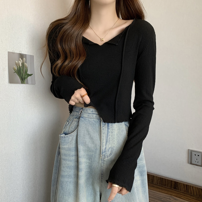 3780#法式锁骨V领内搭长袖女设计感洋气独特别致小个子短款上衣