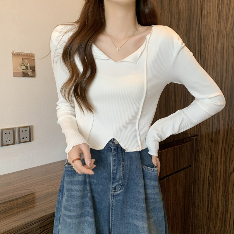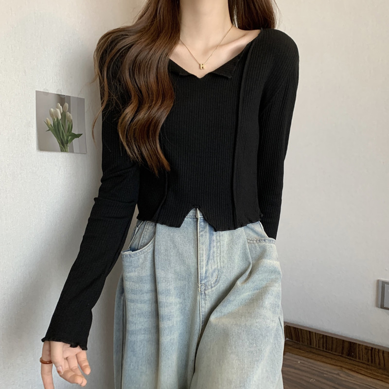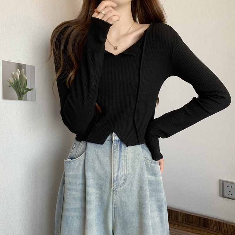 쇄골 라인 V넥 이너웨어 긴팔 여성 디자인 감각이 돋보이는 유니크한 숏 스타일 학생 니트 상의 2025 가을 트렌드